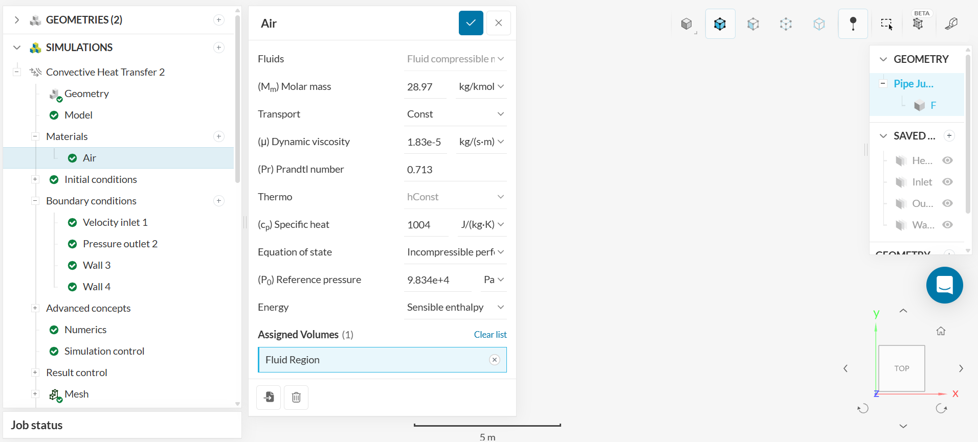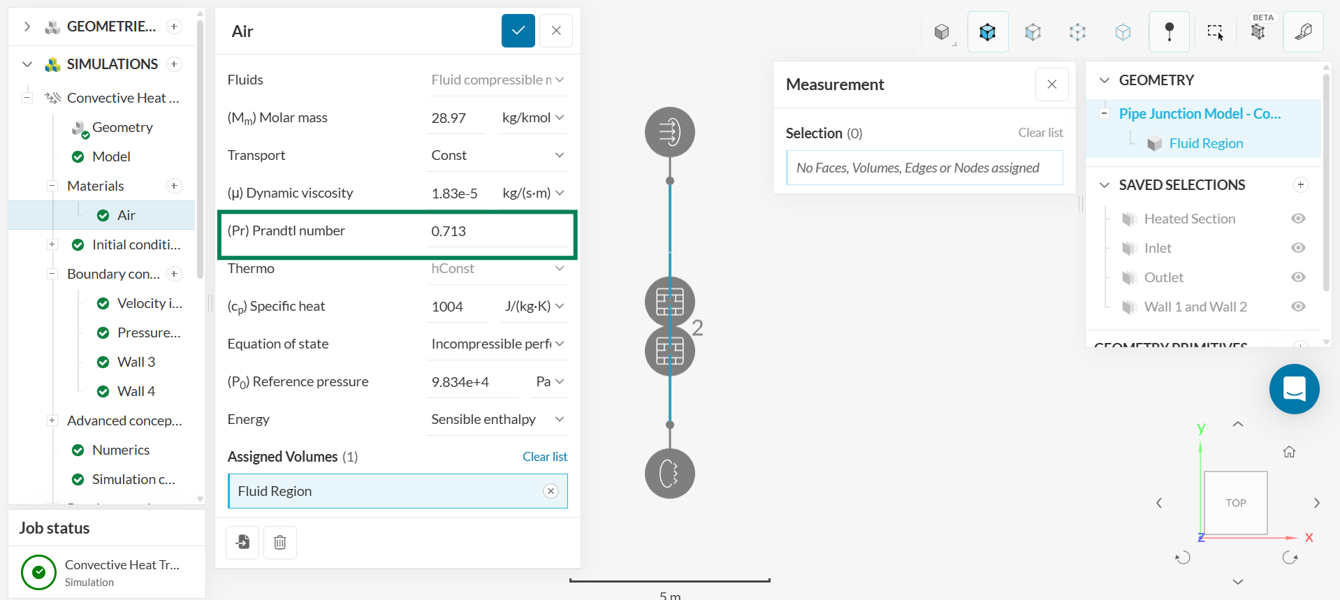 - To find the Prandtl number, navigate to ‘Materials - Air’ in the SimScale Simulation tree to locate the Prandtl number: