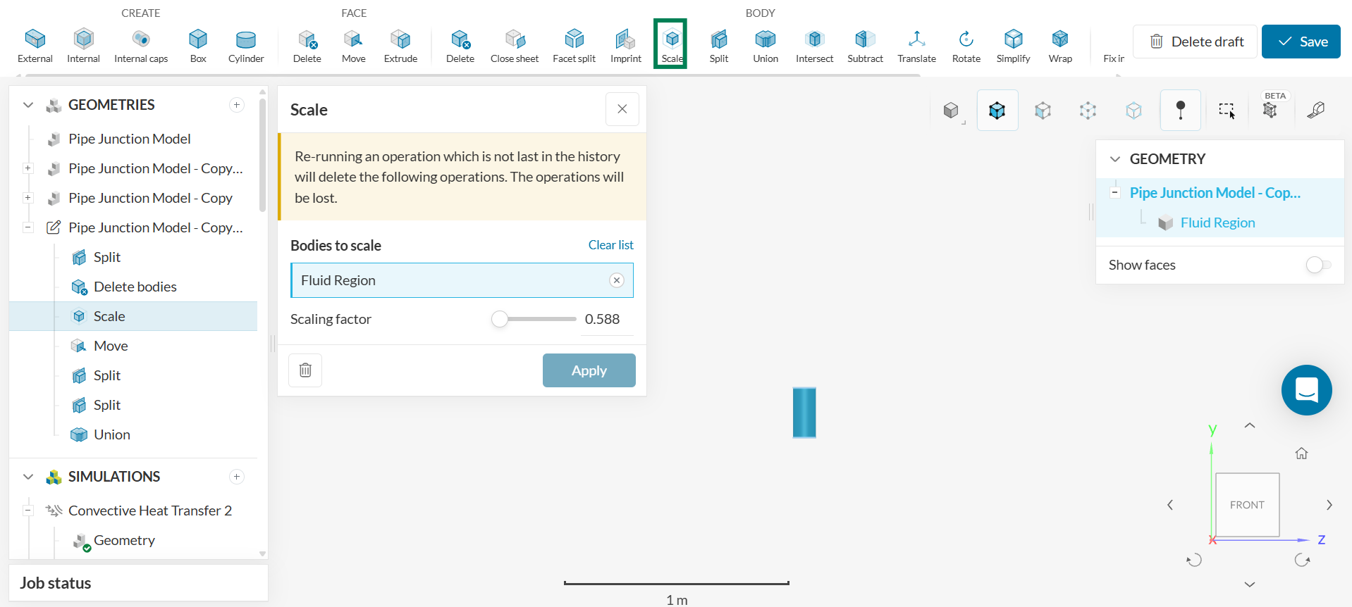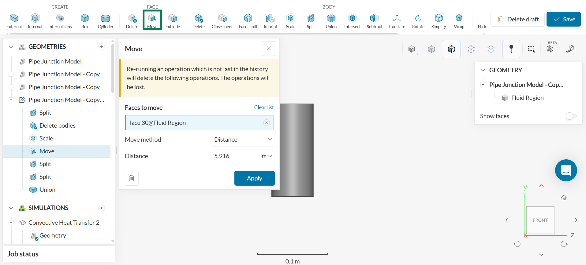 This pipe geometry already has a fluid region assigned to it. The fluid region is the domain of the problem and is the region where the fluid flows. Creating a fluid region is a crucial prerequisite to completing a SimScale simulation. Since a fluid region (specifically an internal flow volume) was already created for the pipe junction flow tutorial, this step does not have to be repeated and the CAD model can be edited to obtain the physical pipe geometry for this simulation. To modify the CAD model, click on ‘Edit a copy.’ Then, follow the remaining steps: