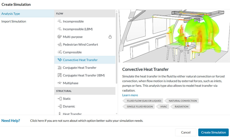 Save the draft. Select the ‘Convective Heat Transfer Analysis Type’ and click ‘Create Simulation.’