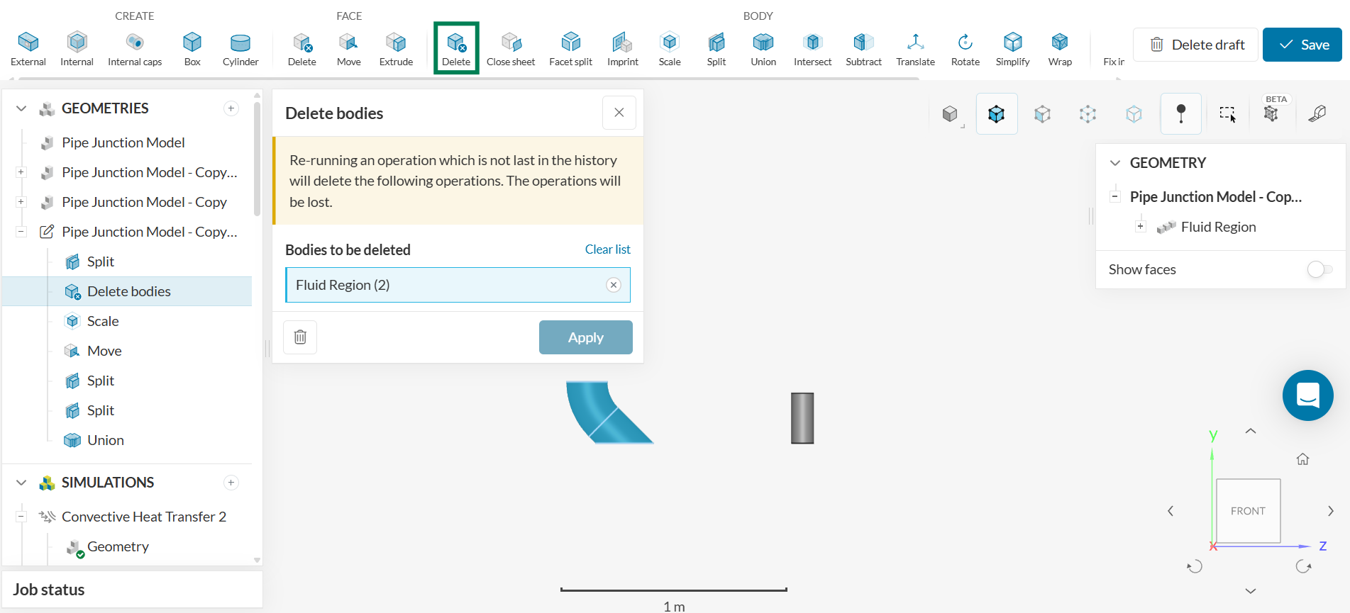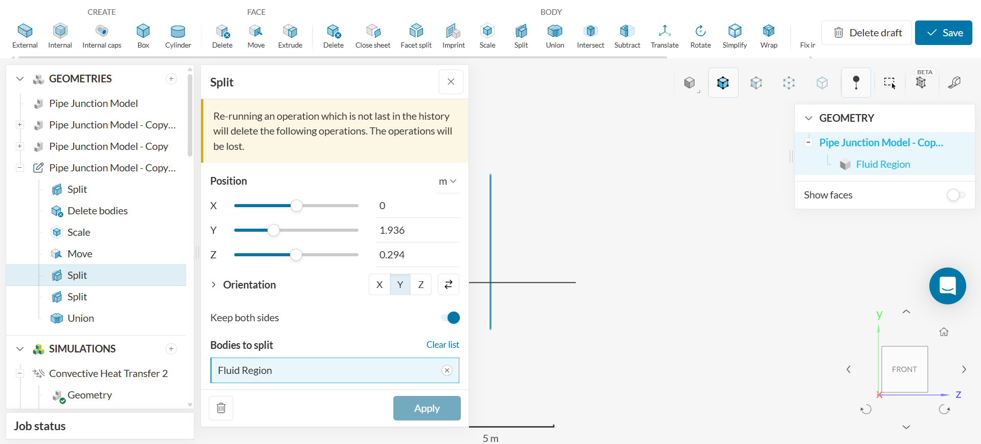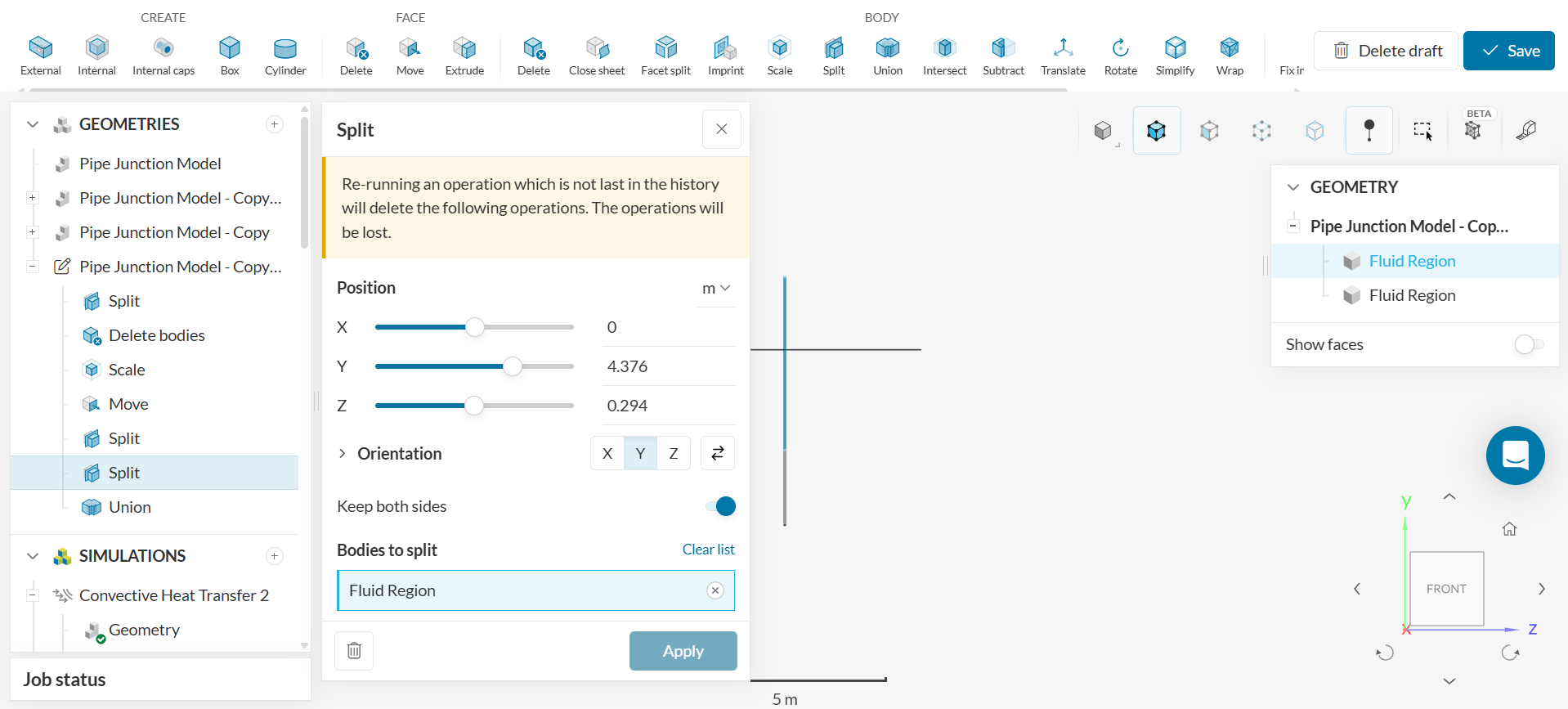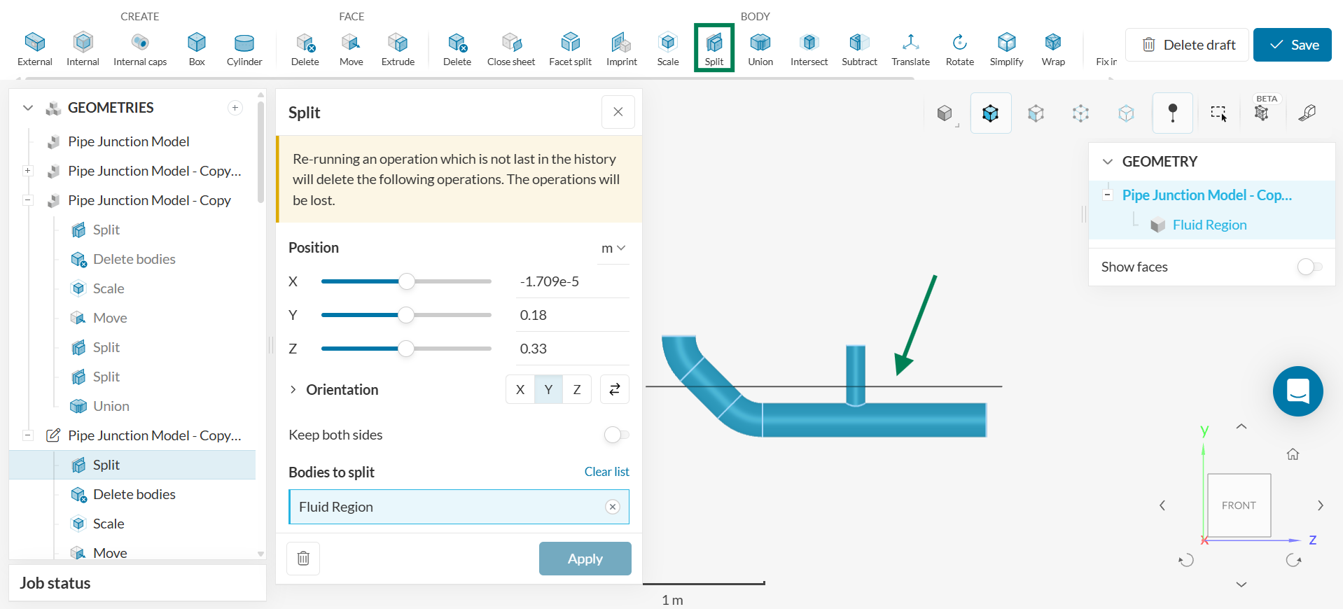 - Click on the ‘BODY – Split’ operation to separate the vertical pipe highlighted. Select the ‘Fluid Region’ as ‘Bodies to split.’ Click ‘Apply.’