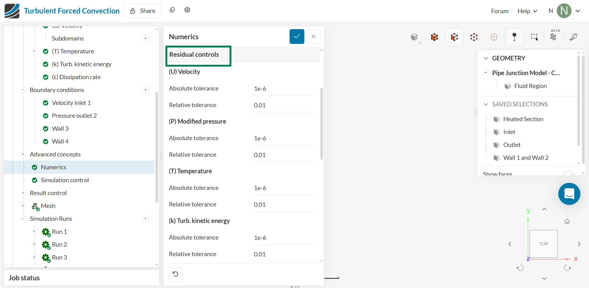 Navigate to ‘Numerics’ and set ‘Absolute tolerance’ to 1e-6 for ‘(U) Velocity’, ‘(P) Modified Pressure’, ‘(T) Temperature’, ‘(k) Turbulent kinetic energy’, and ‘(