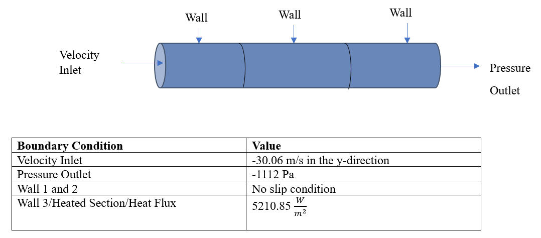 4. Assign a ‘Wall boundary condition’ to Heated Section. Set ‘Temperature Type’ to ‘Turbulent heat flux’ and ‘Heat source’ to ‘Flux heat source.’ Set ‘(q) Heat Flux’ to 5210.85 W/m^2. Keep the ‘Initial boundary temperature’ to 298.15 K.