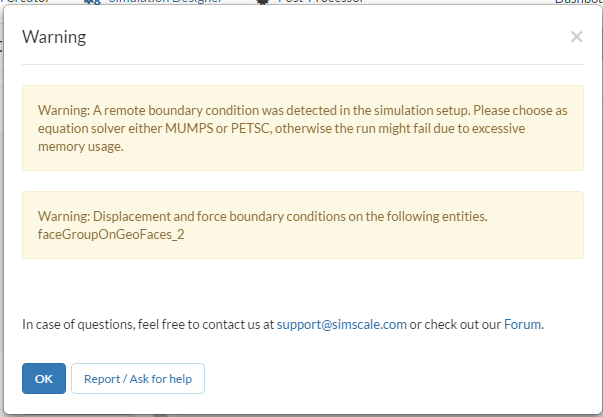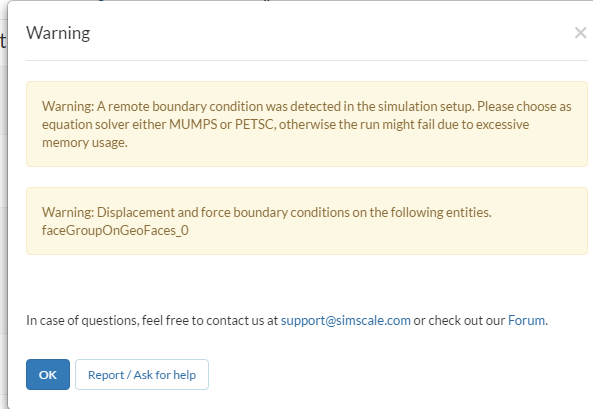 I need to apply a weight of 1kg (Fz = -9.81N) at a point on the top surface 90mm from the clamp, or 100mm from the origin. But I canāt seem to find a combination of distance/face that works. I either get no moment, if I choose face_0 in red above, or, seemingly the wrong moment in that the strain messurements are off by 3 times if I chose face_1 as below. In both cases I get a warning message though the simulation runs and finishes ok. How can I specify this correctly, or do I need to create an artefact in Onshape to apply the force to? If I am doing it right, why are the strain results too low (should be around 1400u and 700u but Iām getting 554u and 224u).