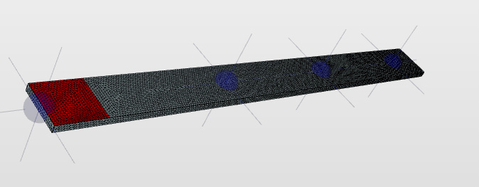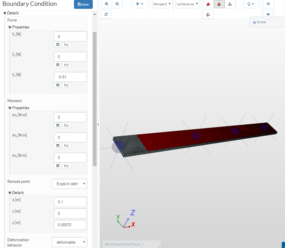 "I need to apply a weight of 1kg (Fz = -9.81N) at a point on the top surface 90mm from the clamp, or 100mm from the origin. But I canāt seem to find a combination of distance/face that works. I either get no moment, if I choose face_0 in red above, or, seemingly the wrong moment in that the strain messurements are off by 3 times if I chose face_1 as below. "