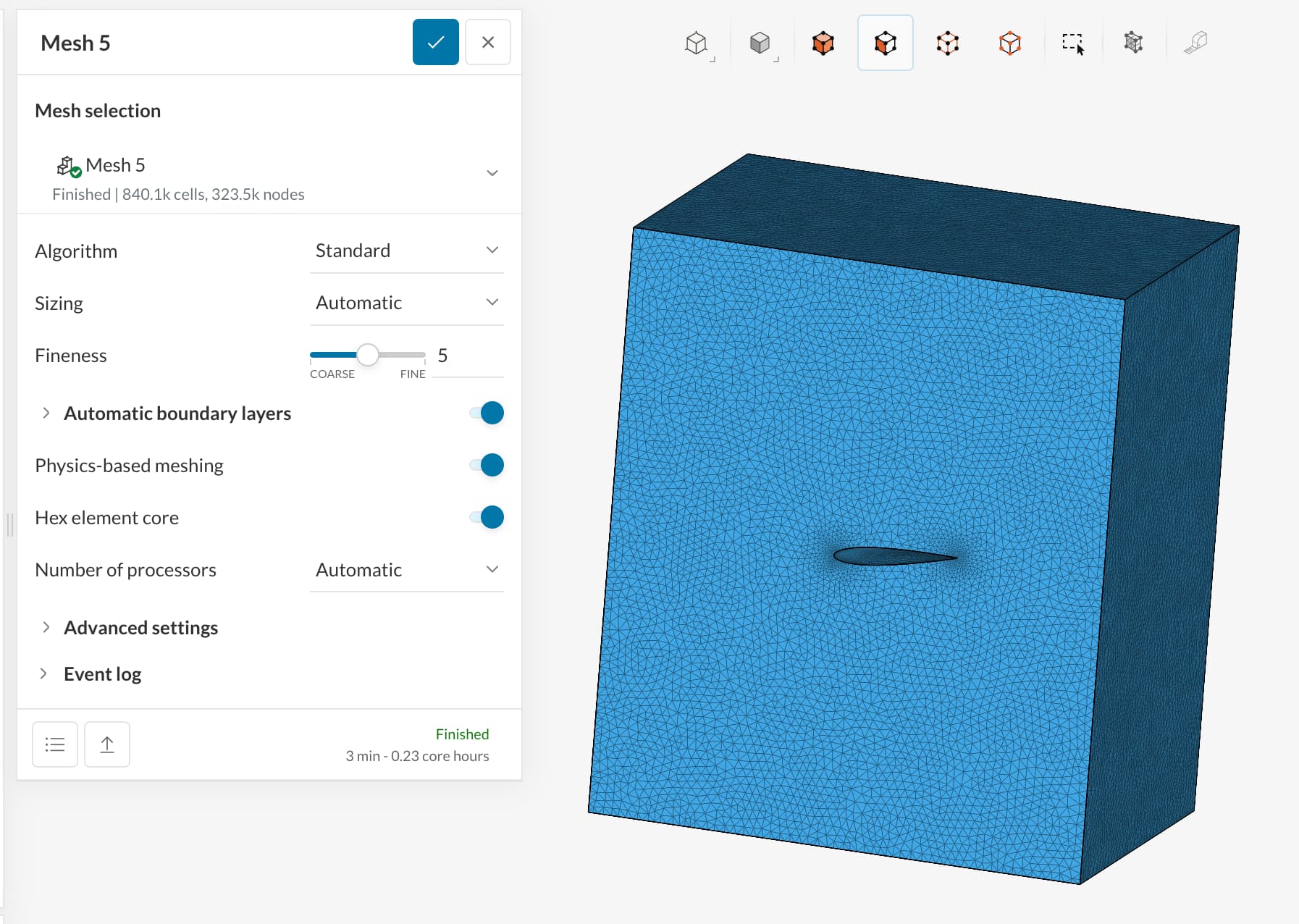 Now I have created a mesh with standard default settings, to begin with. The mesh has around 380k nodes. The overall mesh quality is 0.39 which is acceptable. And the non-orthogonality is 0.79