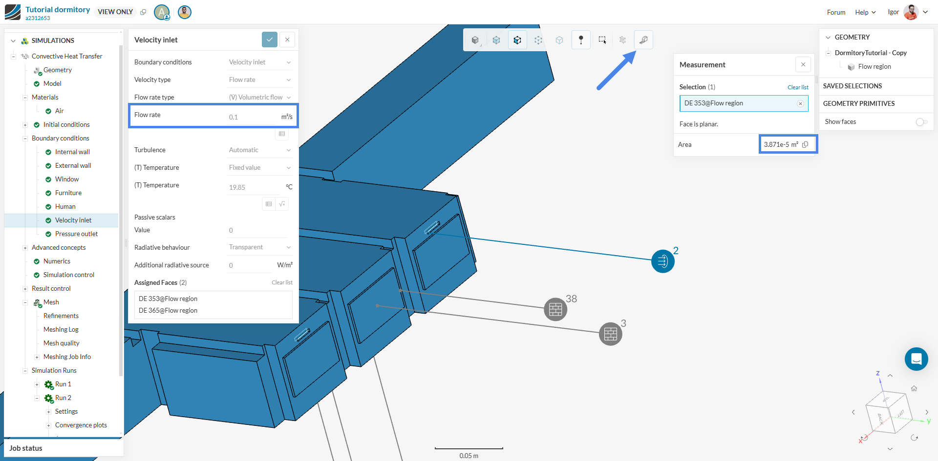 Then, I see you’re applying a 0.1 m^3/s flow rate to a 3.81\times 10^{-5} m^2 area face: