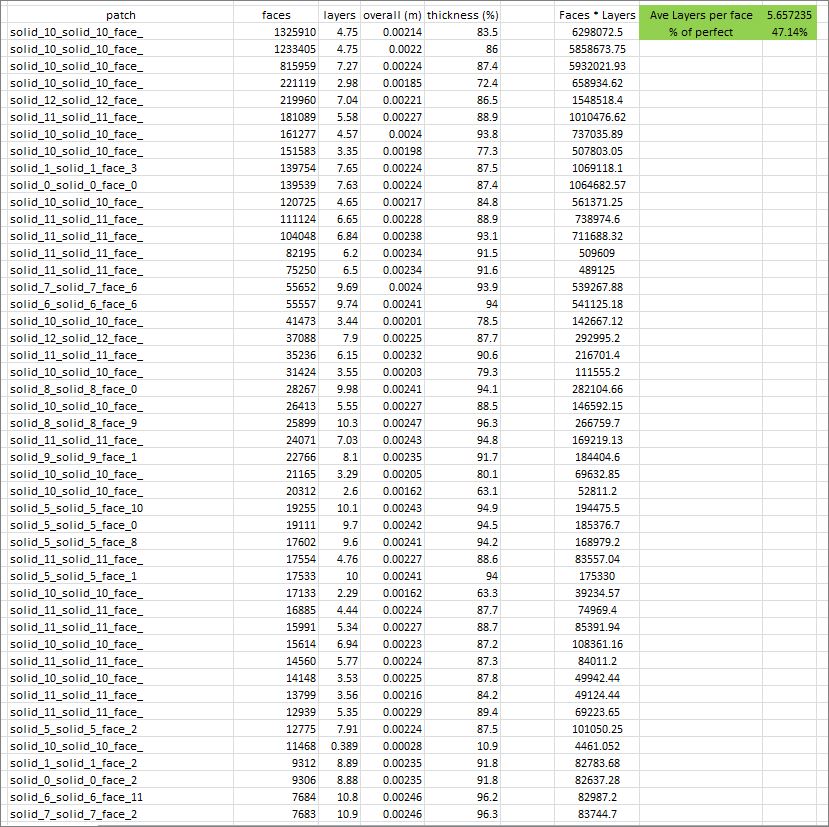 I calculate ‘Average Layers per Face’ and dividing that by the ideal # of layers requested I calculate ‘% of perfect’.