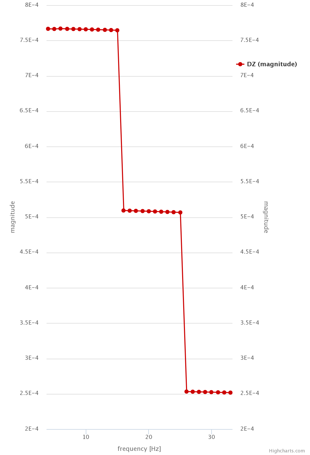 As you can see, the 3 levels of displacement expected are pretty clear, but instead of being flat levels they decrease with the frequency. This is not happening when it comes to VERTICAL excitation.