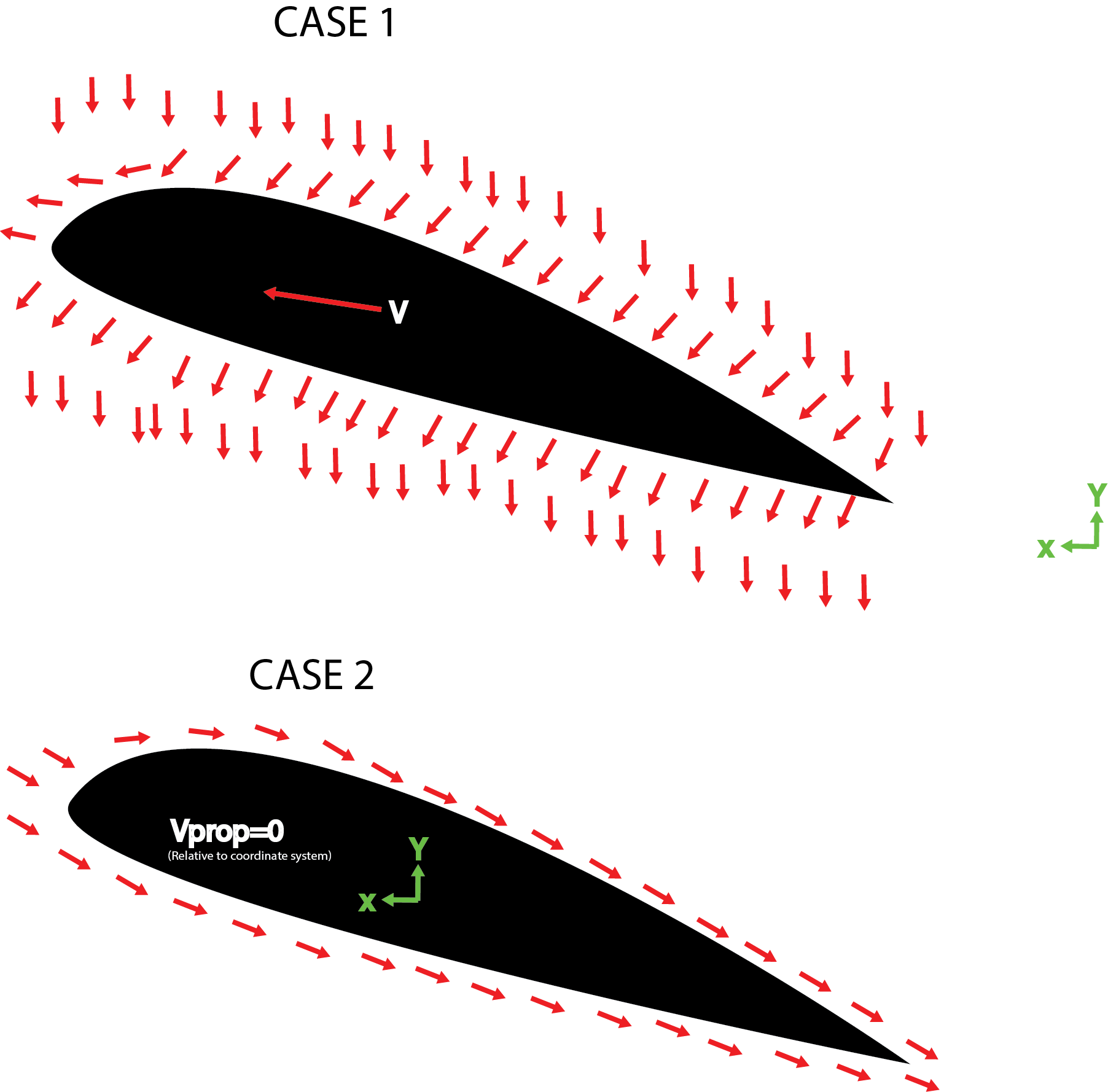 If you freeze time and slice the propeller blade airfoil with a plane, the velocity field in that plane would look something like case on case 1, on the picture below.