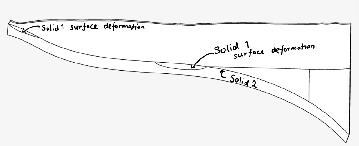 I am solving a solid mechanics deformation problem. In which I am getting unexpected deformation at two locations on the surface of body 1 (see attached pic). The underlying body is not deforming at all, and I am not sure how the top body is deforming through the underlying body 2, only at specific locations.