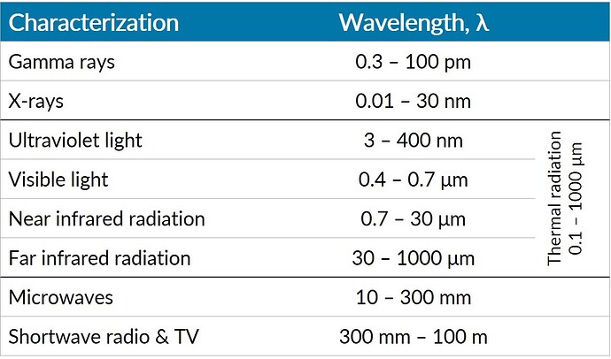 Electromagnetic radiation can be seen as a stream of photons, each traveling in a wave-like pattern, moving at the speed of light and carrying energy. The difference between the different forms in the electromagnet spectrum is the energy of the photons. It is important to keep in mind that if we talk about the energy of a photon, the behavior can either be that of a wave or that of a particle which we call the “wave-particle duality” of light.