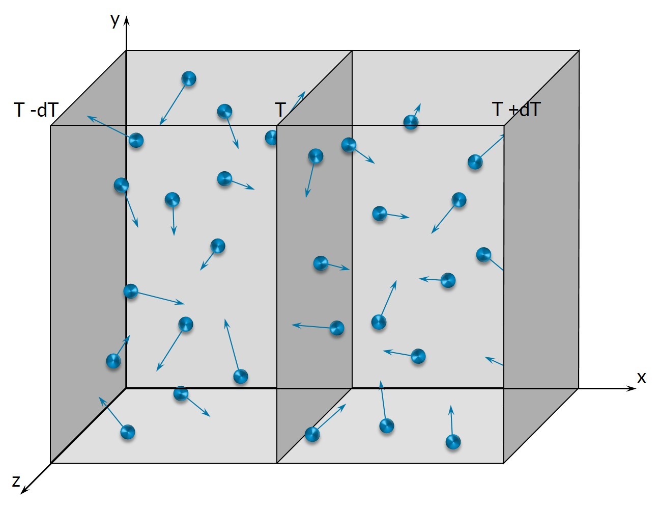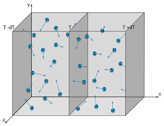 The thermal conductivity of gases can be understood with the imagination of molecules. These molecules move through thermal movement from one position to another position as can be seen in the picture below.