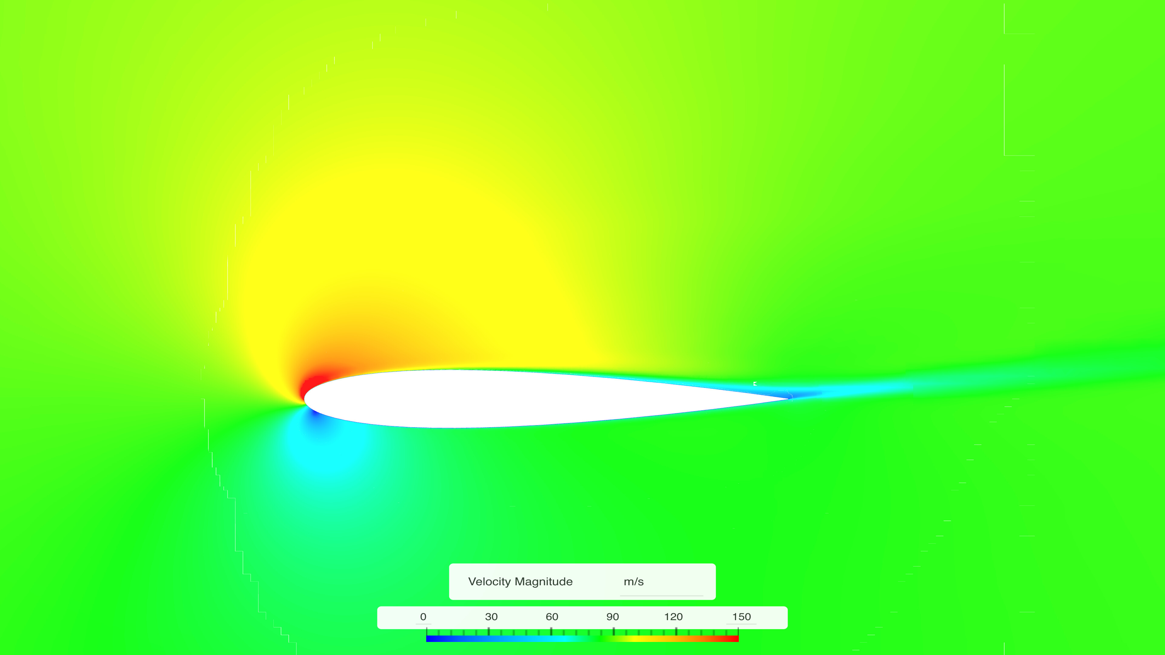 The image shows a typical slender body with attached flow over most of the wing section, this is a wind section with a NACA 0012 profile, in an angle of attack of 10 degrees.