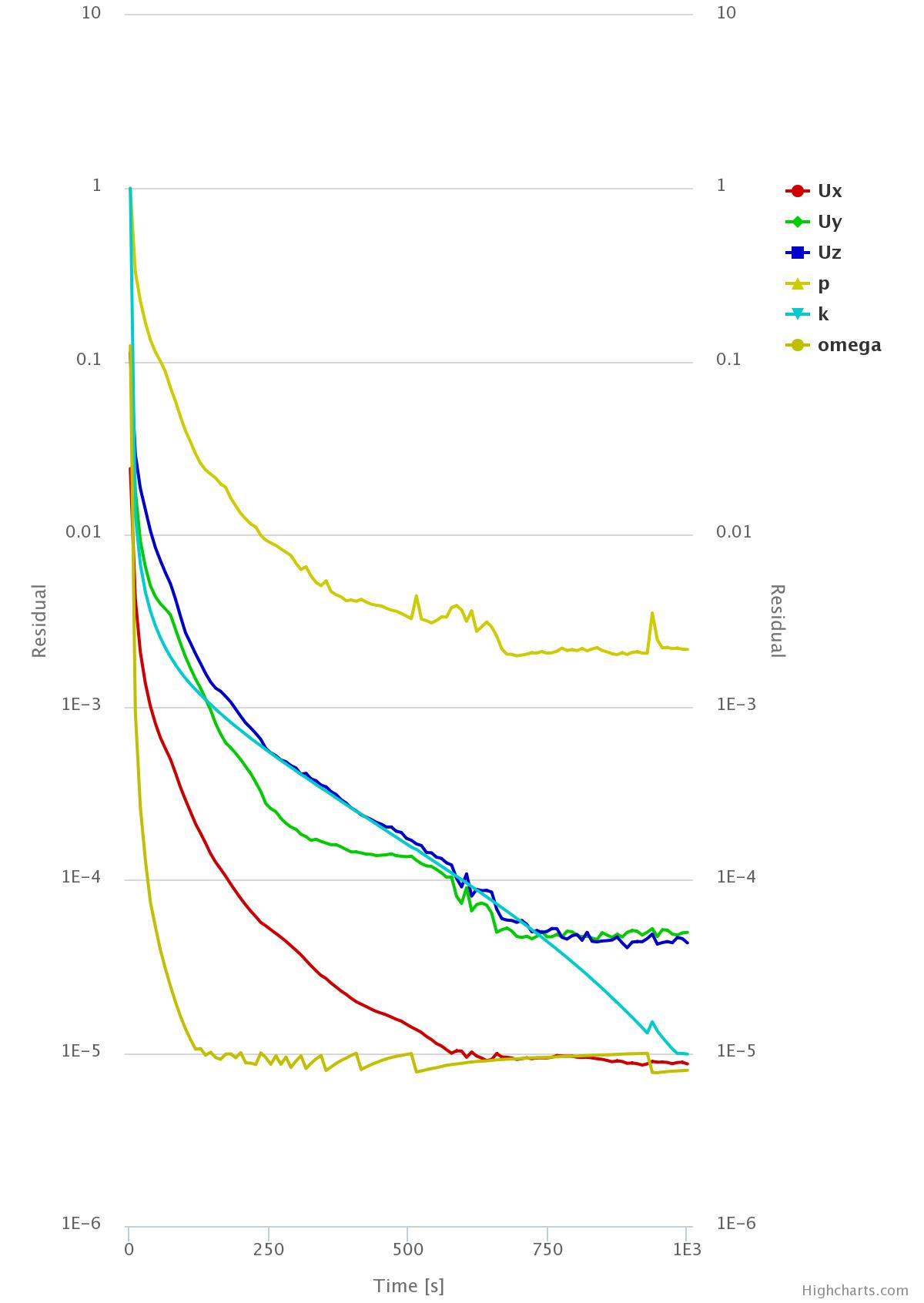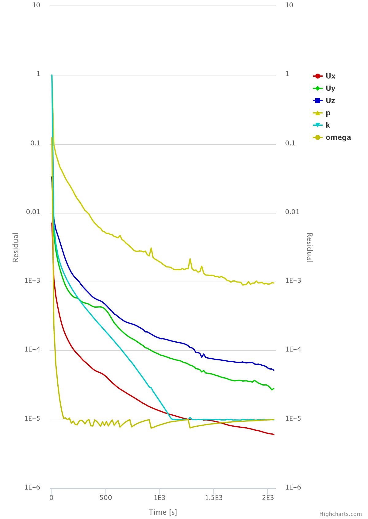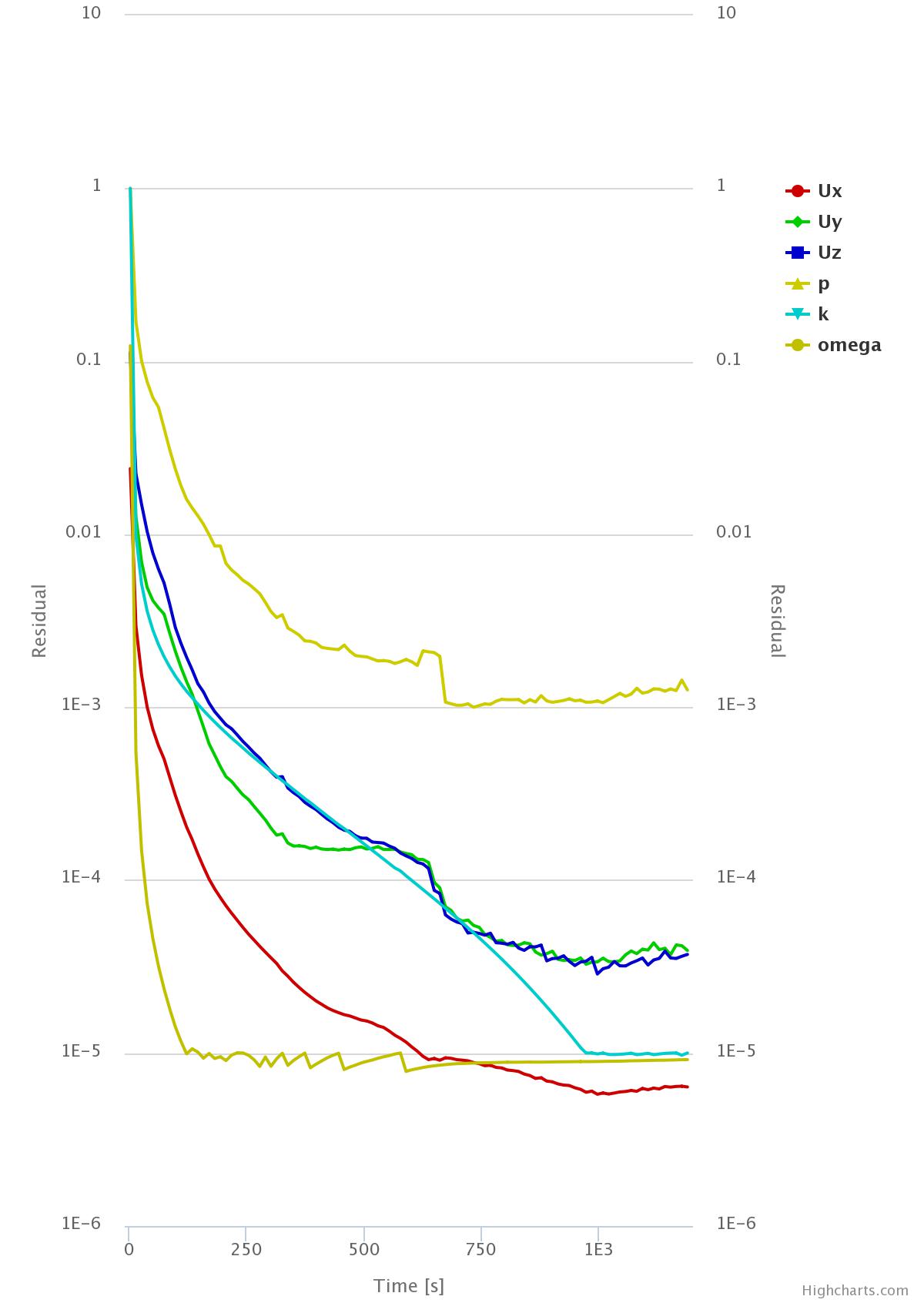 I’ve used your recommendation to adjust the velocity relaxation factors to get the pressure better converge. However as you can see below, increasing the relaxation factor to 0.8 actually causes the pressure to reach steady-state much further away from the ideal 1e-3 point.
