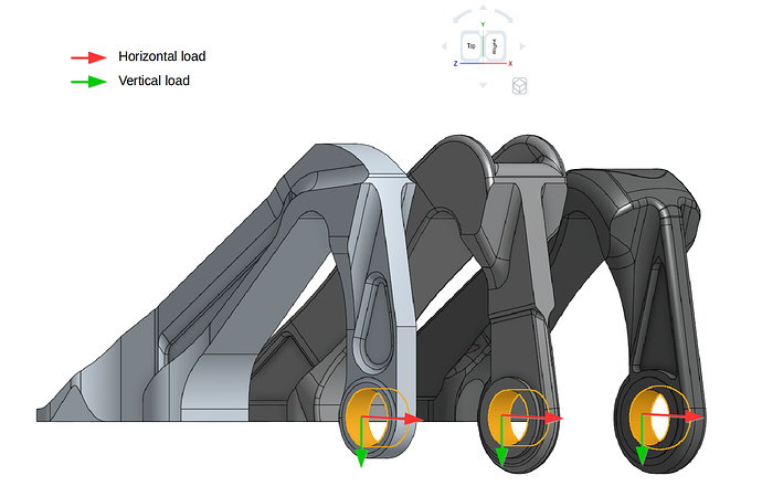 This exercise focuses on the the testing of these three models based on the similar horizontal and vertical load provided in the GrabCAD challenge . In addition to this, the models were further tested considering the nonlinear plastic material and also increasing both loads. The applied constraint and loading boundary conditions are shown below. Please note that separate simulations were created for both loading types.