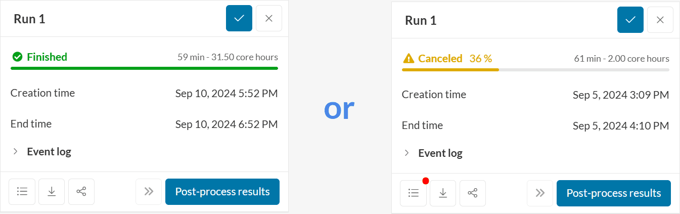 If a simulation fails unexpectedly due to a system issue, core hours are not deducted from your account. In such cases, the operation will be highlighted in red, indicating a system failure.