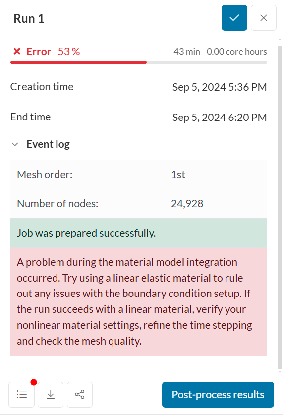 - Failed simulations due to system errors: If a system error occurs (e.g., divergence in a CFD simulation, matrix not factorizable in an FEA case, issues during material model integration), as shown in Figure 2, this will not result in core hour usage.