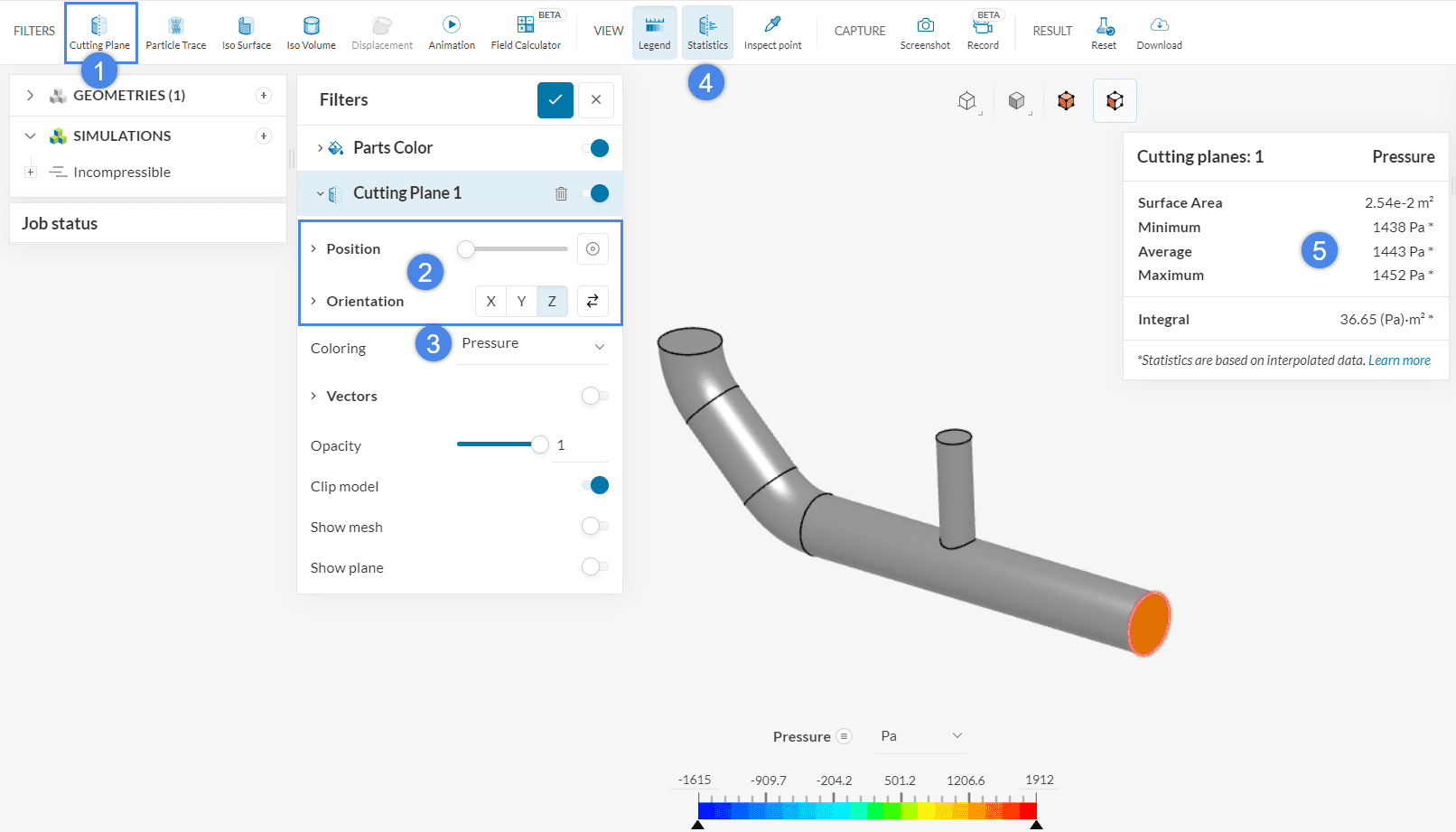 Another option to determine the pressure drop between the inlet and outlet of the pipe is within SimScale’s post-processor. The workflow consists of creating cutting planes next to the inlet and outlet, and using the Statistics feature to plot the average pressure levels: