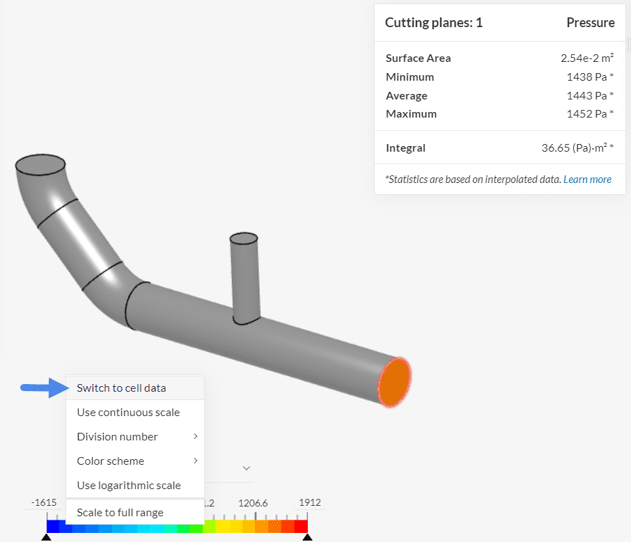 To display cell data, simply right-click on the legend bar and then click on ‘Switch to cell data’. The average pressure at the inlet is obtained from the information box. At this point, we can follow the same approach, creating a plane next to the outlet: