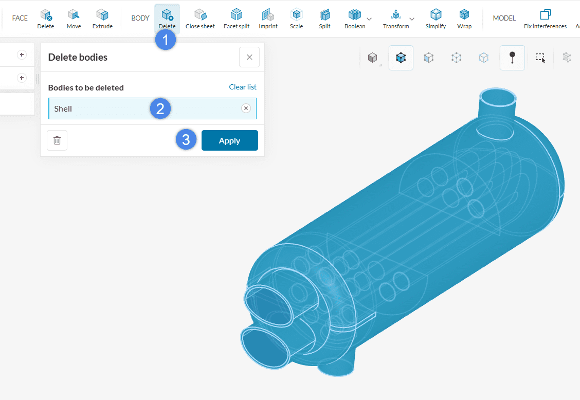 - Pick the solid volume that needs to be removed. In this example, it is the Shell of the heat exchanger