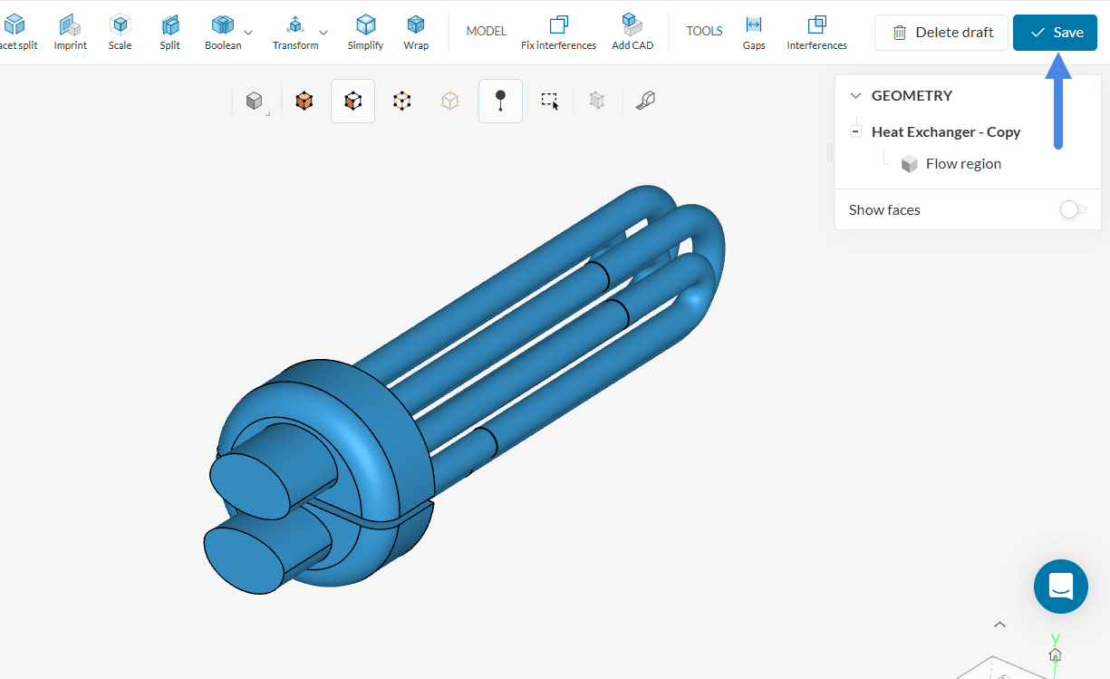 After the flow volume extraction, you can delete the solid bodies to perform a convective heat transfer analysis. Finally, export the model to the Workbench by clicking on the ‘Save’ button in the upper right corner.