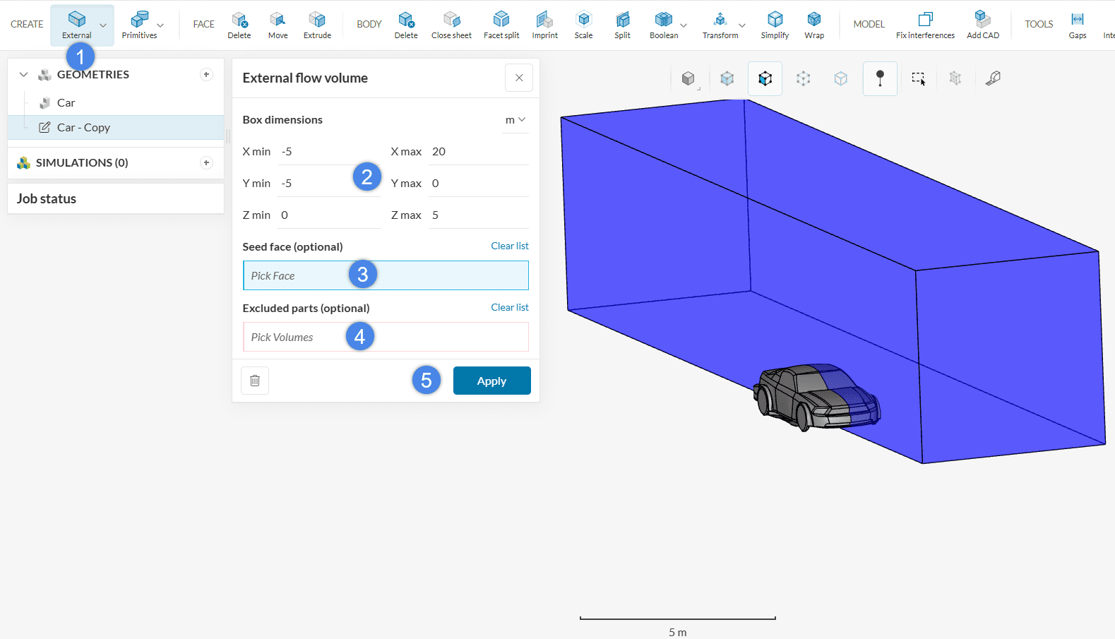- Define the External flow volume size by adjusting the minimum and maximum coordinates of the flow domain box