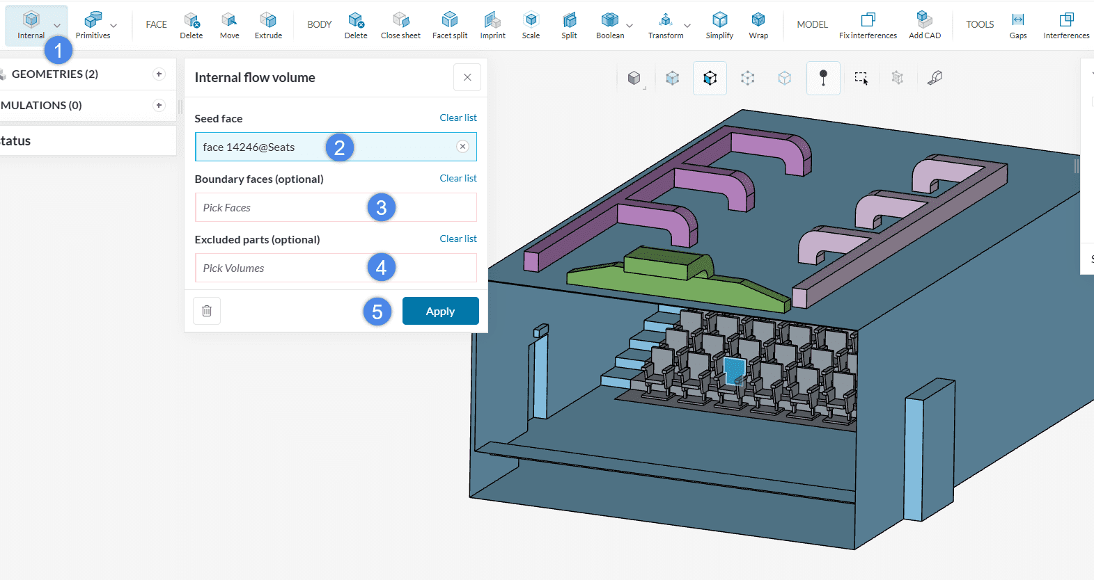 If this is the case, the only mandatory definition for an internal flow volume creation is a seed face. By hiding some of the external faces of the theater you will be able to select a seed face on the inside of the model.