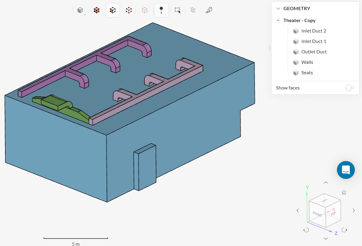 In the following image, you see the walls and ducting system of the theatre model highlighted in this tutorial. This theater room does not have any openings on the walls or duct system.