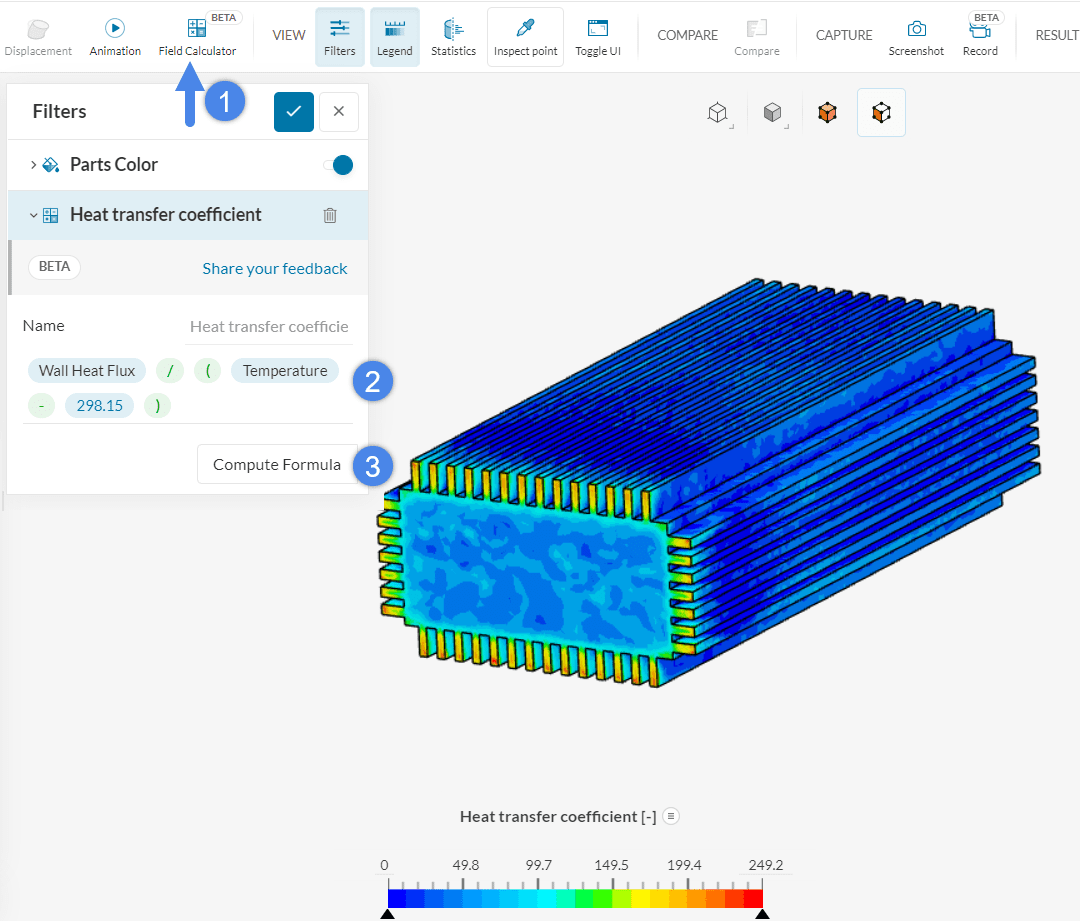 In some cases, it can be useful to analyze different regions of the domain with different reference temperatures. Instead of running multiple result controls with different temperatures, users can take advantage of the Field Calculator filter, and input the heat transfer coefficient formula manually:
