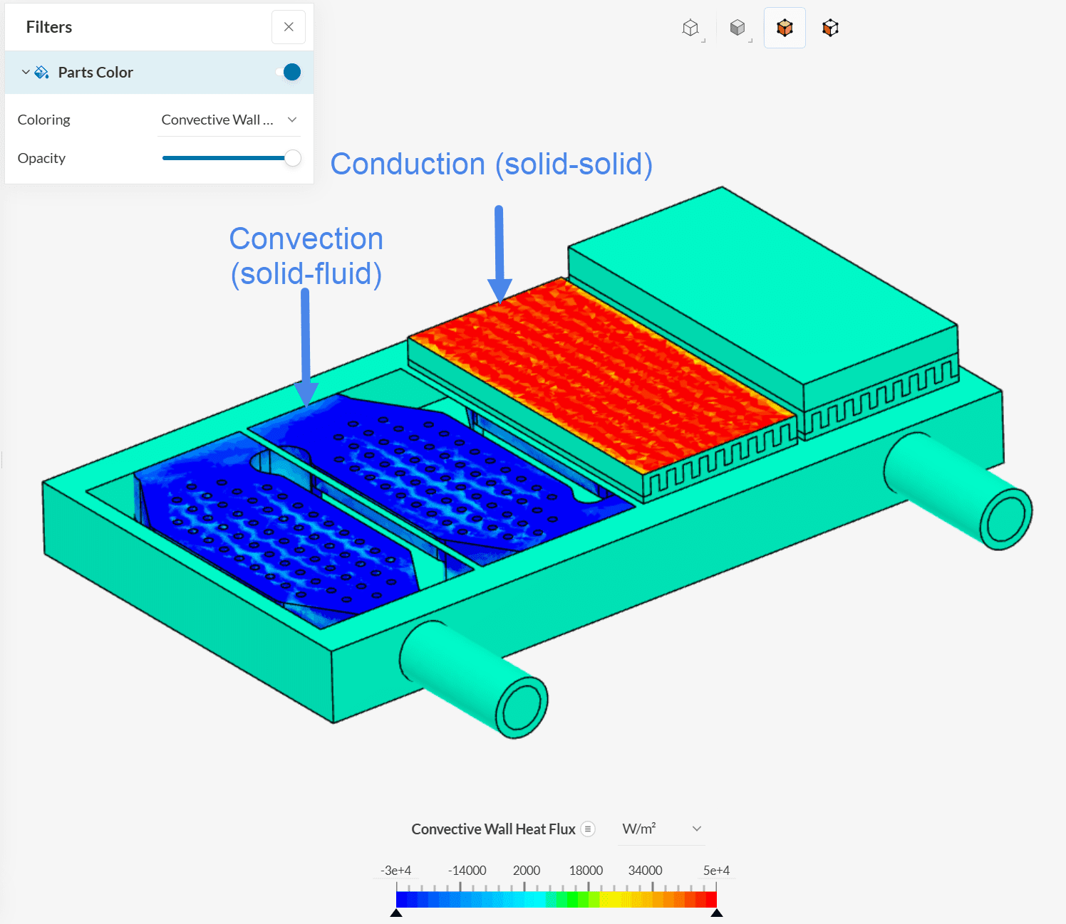 For example, taking a Conjugate Heat Transfer simulation using the cold plate from Figure 8, we can observe convective heat fluxes between water and the cold plate in the post-processor, as well as heat fluxes due to conduction on the interfaces of the chips.