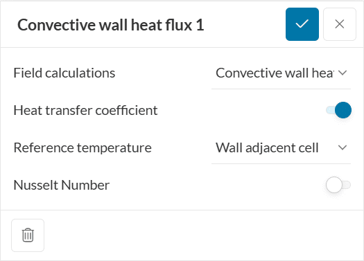 The Heat transfer coefficient toggle is available under the Convective wall heat flux result control, within Field calculations. When Heat transfer coefficient is active, the user has two options to define the Reference temperature (\(T_{reference}\) from equation 1):