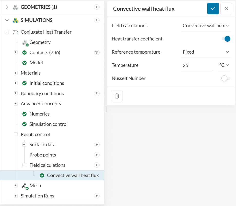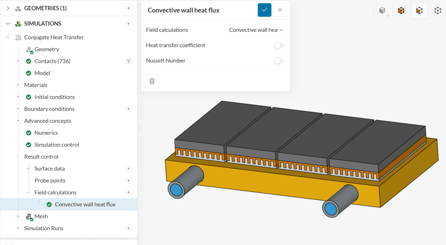 In SimScale, to obtain numerical results for the heat transfer coefficient, the user needs to set a result control before running the simulation: