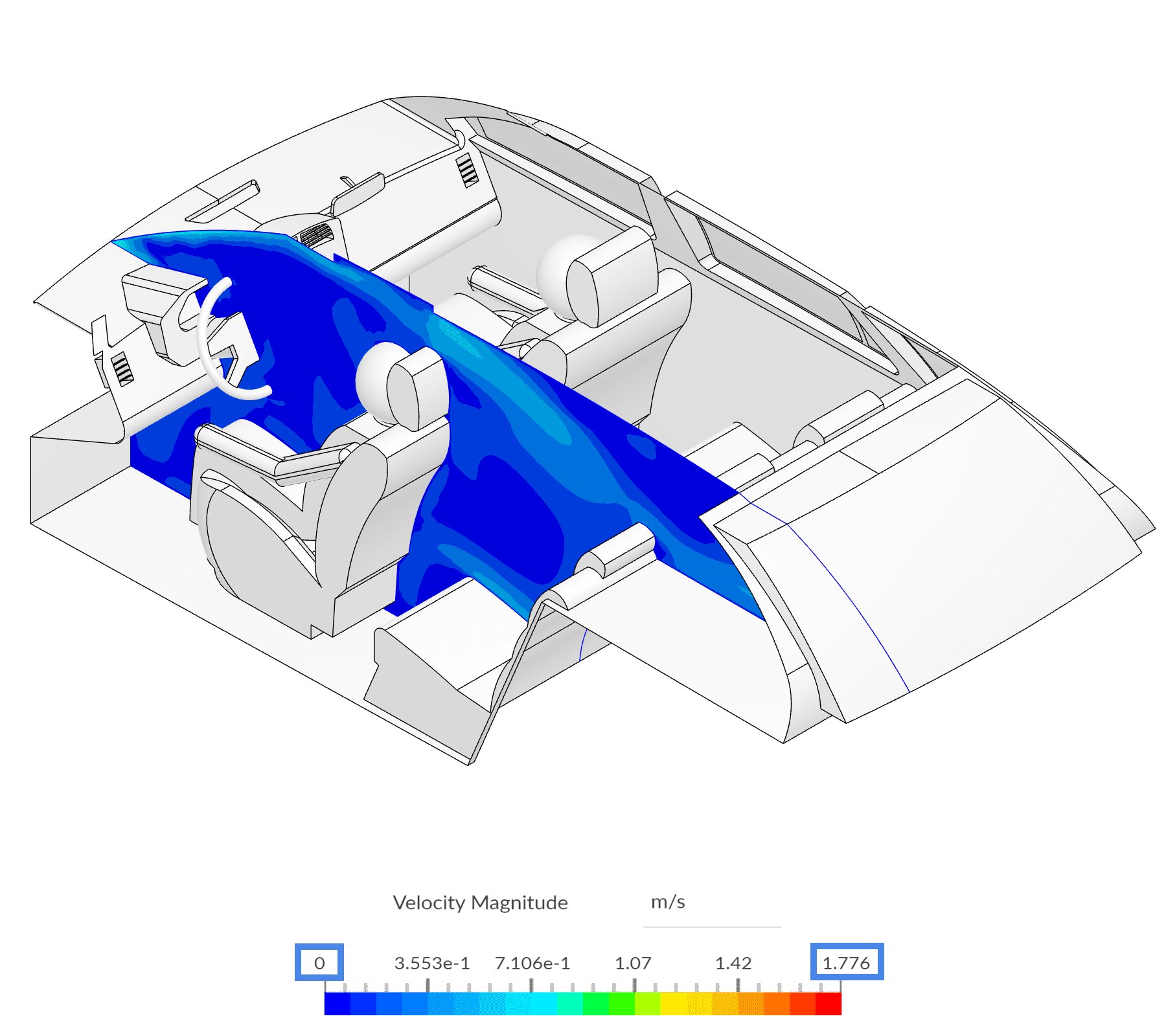 To showcase the legend customization workflows, we will inspect the results of the Internal Thermal Comfort of a Car tutorial. In this project, the largest velocity values are observed on the vents, which act as inlets.