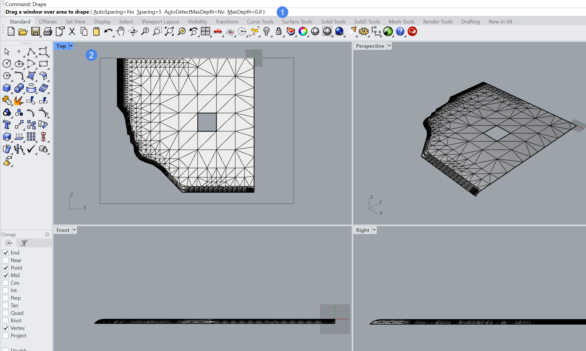 - Use the Drape command. Depending on how uneven the topology is, it is recommended to adjust the Spacing (i.e. resolution) and other drape settings.
