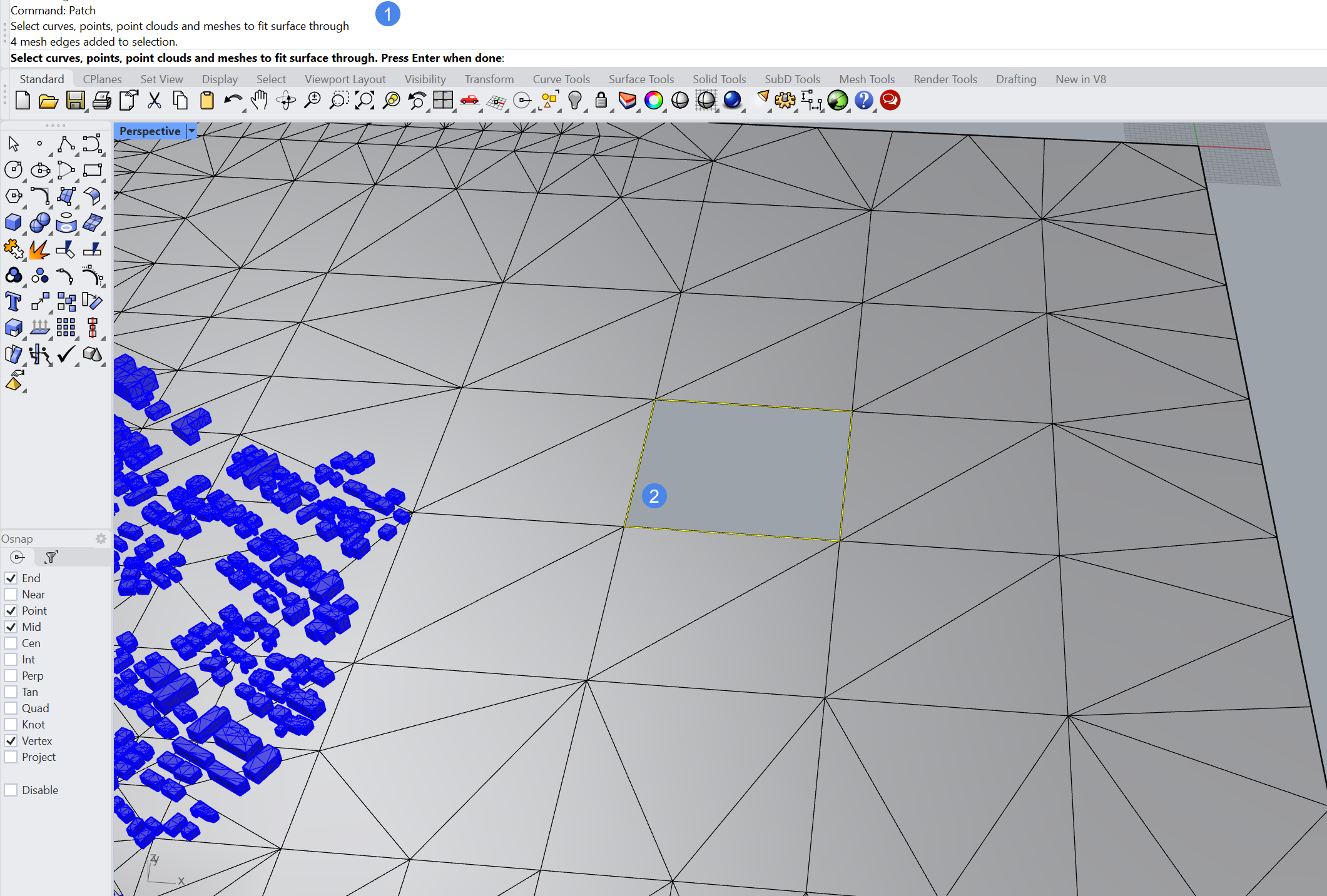 Taking the geometry from Figure 1, if we know where the hole is, there are several workflows in Rhino that allow you to close it. Here we will discuss a couple of patch commands.