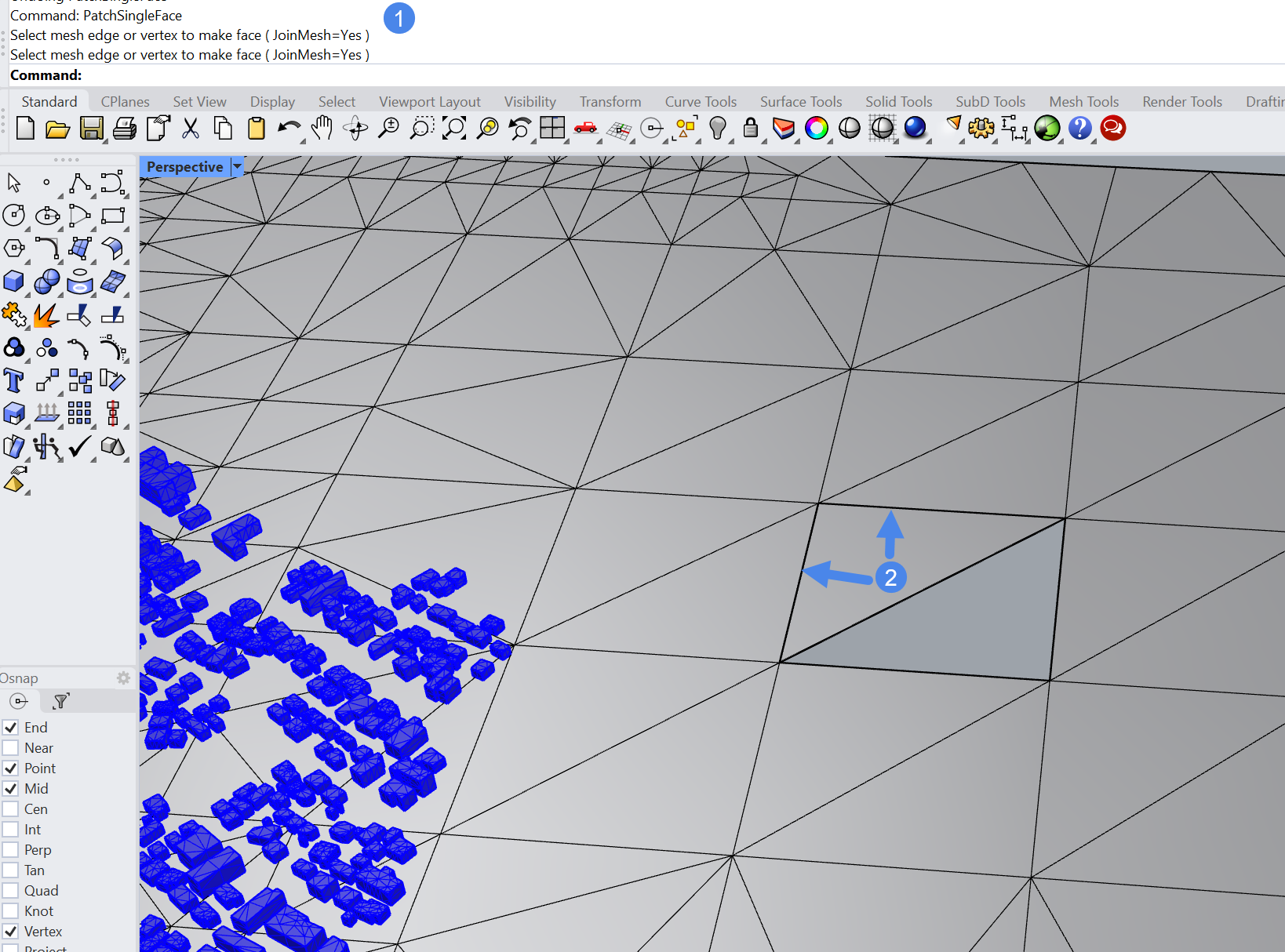 The PatchSingleFace command is similar to Patch, however it creates one triangle at a time. After entering the command in Rhino, you can shift-select two edges from the hole, and a new triangle is created. Still using the Figure 1 geometry, since the hole is a square, we would need to use PatchSingleFace twice to fully close it: