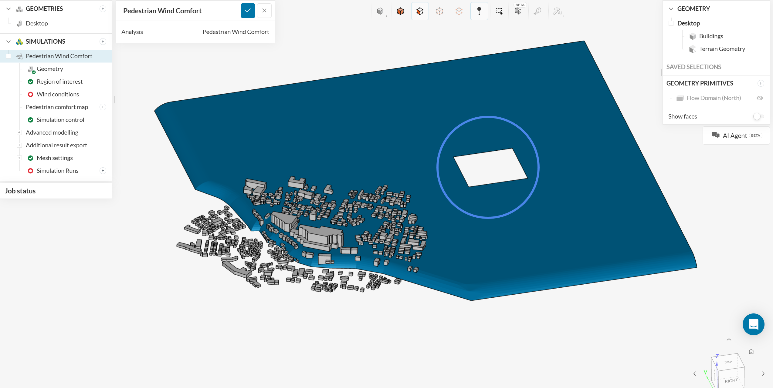 When preparing geometry for the PWC analysis, it is important that the combination of the terrain and the buildings is continuous. If there are holes large enough in the geometry for the local mesh cells to fit, the mesh may extend through the hole. For demonstration purposes, the hole highlighted by the blue circle below would cause meshing problems: