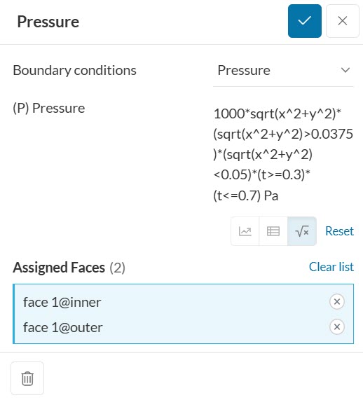 Now, an IF-statement can be implemented if we wish to apply the pressure distribution at a specific portion of disc. As an example, the pressure will be applied only when the radius is larger then 0.0375m. The required expression is