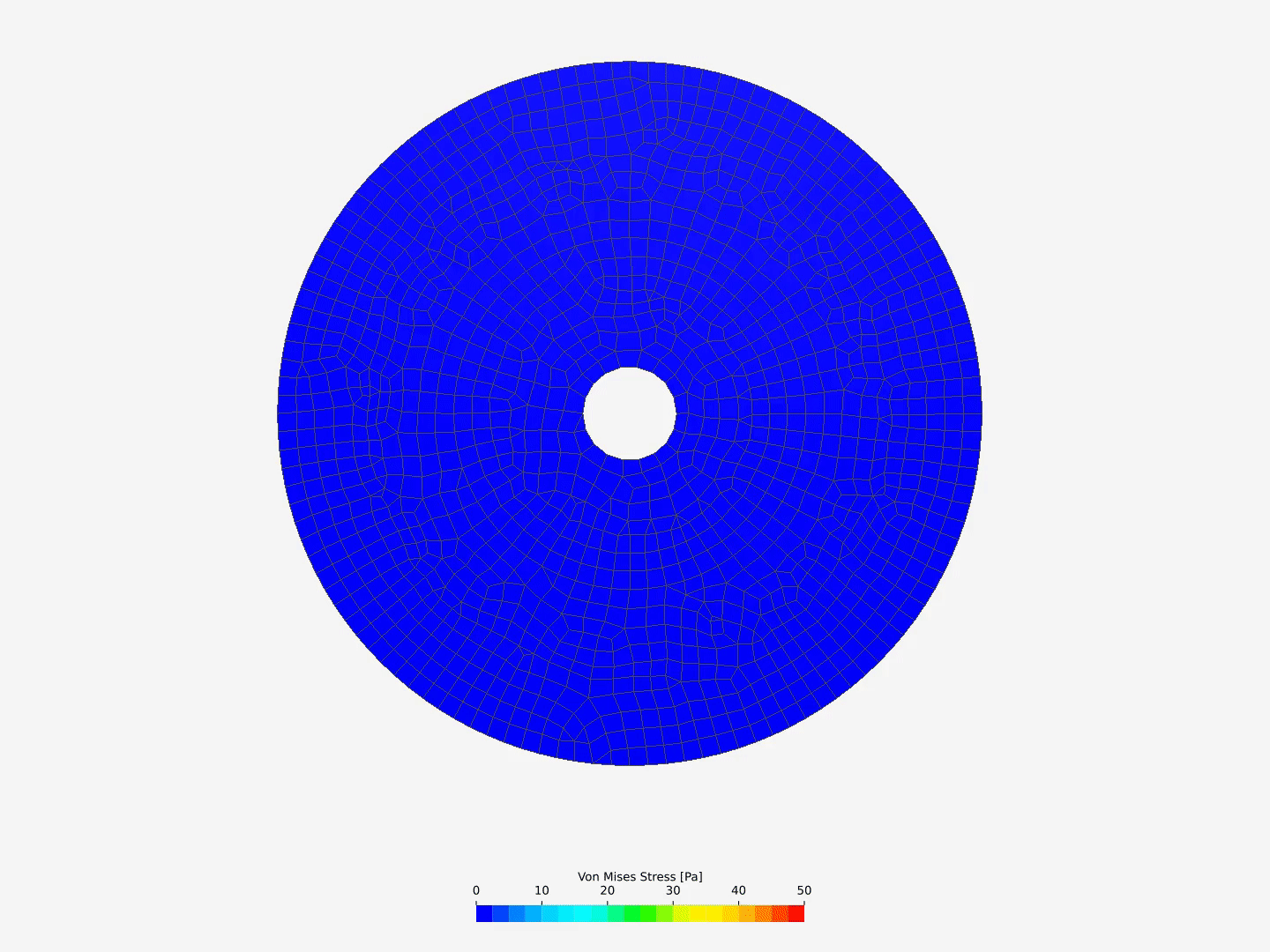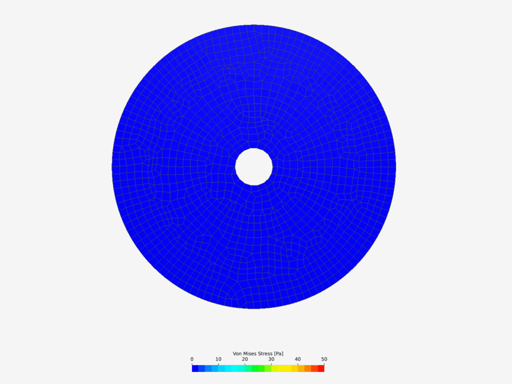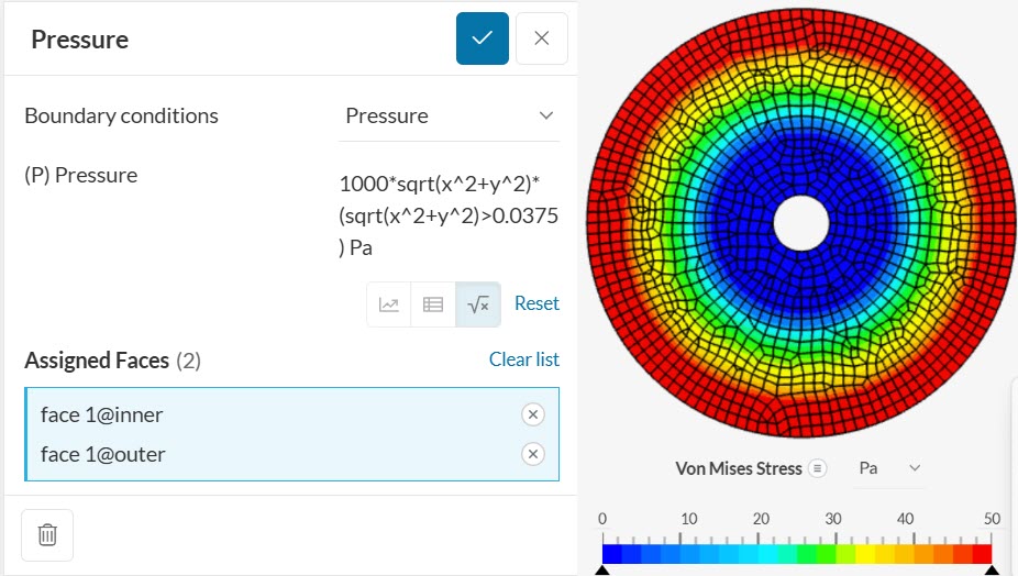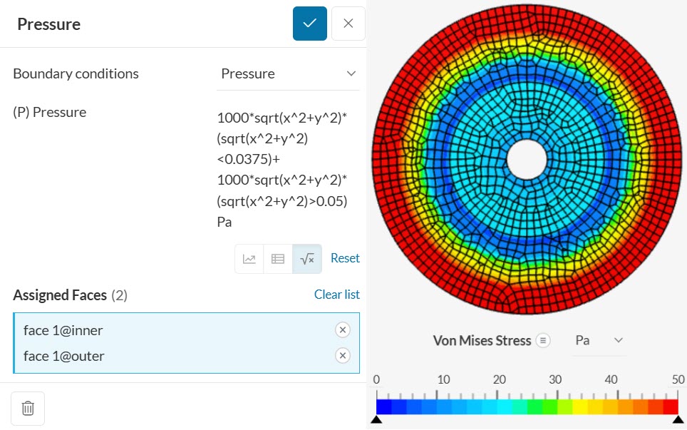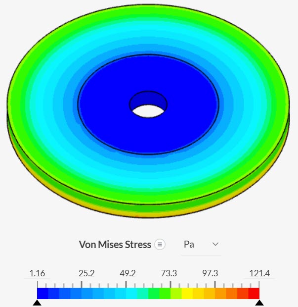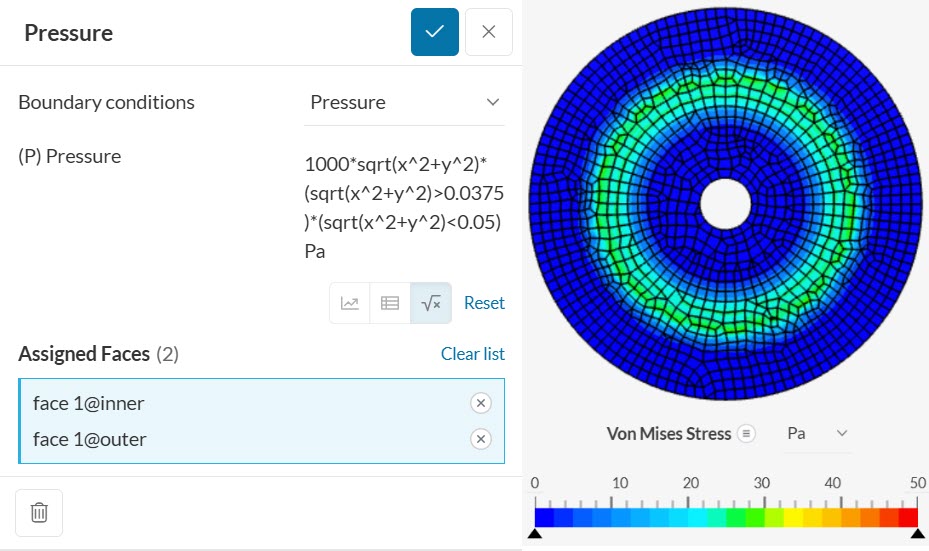 In SimScale, this pressure distribution implementation and its corresponding Von-Mises stress distribution on the disc are depicted as follows: