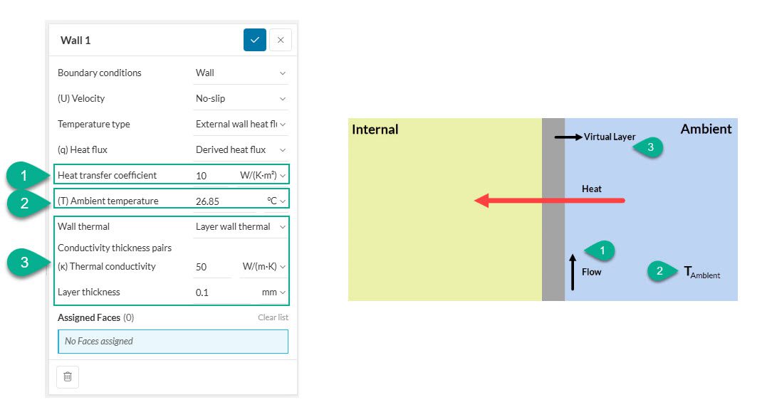With this option, you need to define the flow situation outside the wall by specifying the convective heat transfer coefficient. Additionally, you can enable Wall Thermal to introduce a virtual layer, where you can define its thickness and thermal conductivity. This virtual layer represents an insulating or conductive material attached to the wall, affecting the overall heat transfer.