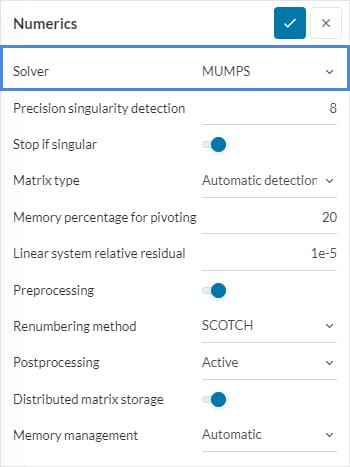 - Change the solver for structural analysis: For structural analysis, changing the solver to ‘Multifrontal’ will make the simulation run faster as it behaves well for parallelization. You can change the solver by going to ‘Numerics’.