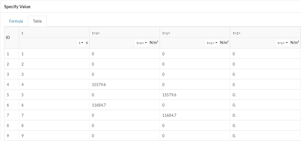 Notice how we have labeled each load case with the time variable and specified the value for the load components for each one of them, including the zero values when the load doesn’t apply. As we are performing a linear static simulation, the solution is independent of time. Thus, we can use the time variable to enumerate our load cases.