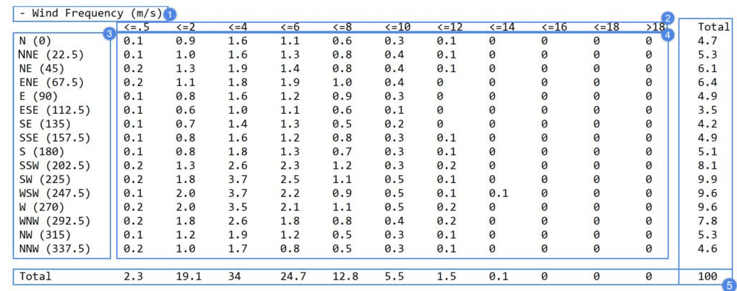 - The total: The total proportion of each wind speed interval and the total proportion of wind coming from each direction is also necessary.
