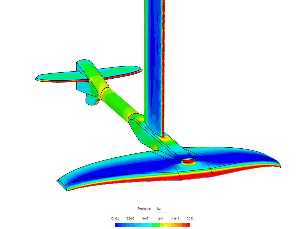 Once the simulation run is complete, we can examine the pressure distribution on the hydrofoil by hiding the outer faces of the flow domain, allowing a clear view of the hydrofoil’s surface.