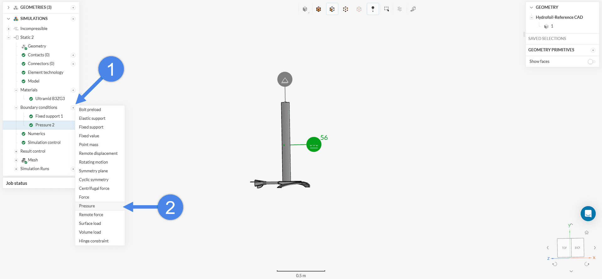 The final step in conducting an FSI study with SimScale is to import the pressure data into the Static analysis simulation. To accomplish this, simply create a Pressure boundary condition and apply it to the relevant surfaces.