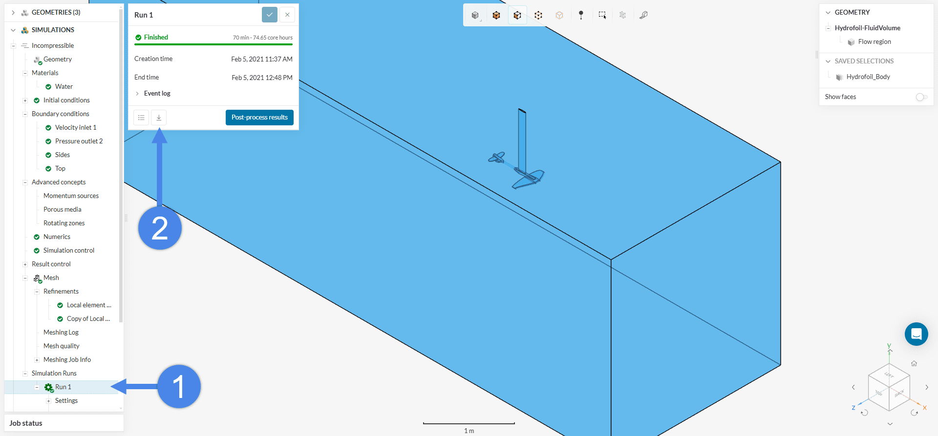 To start, click on the completed simulation run, then select the download button to retrieve the results.