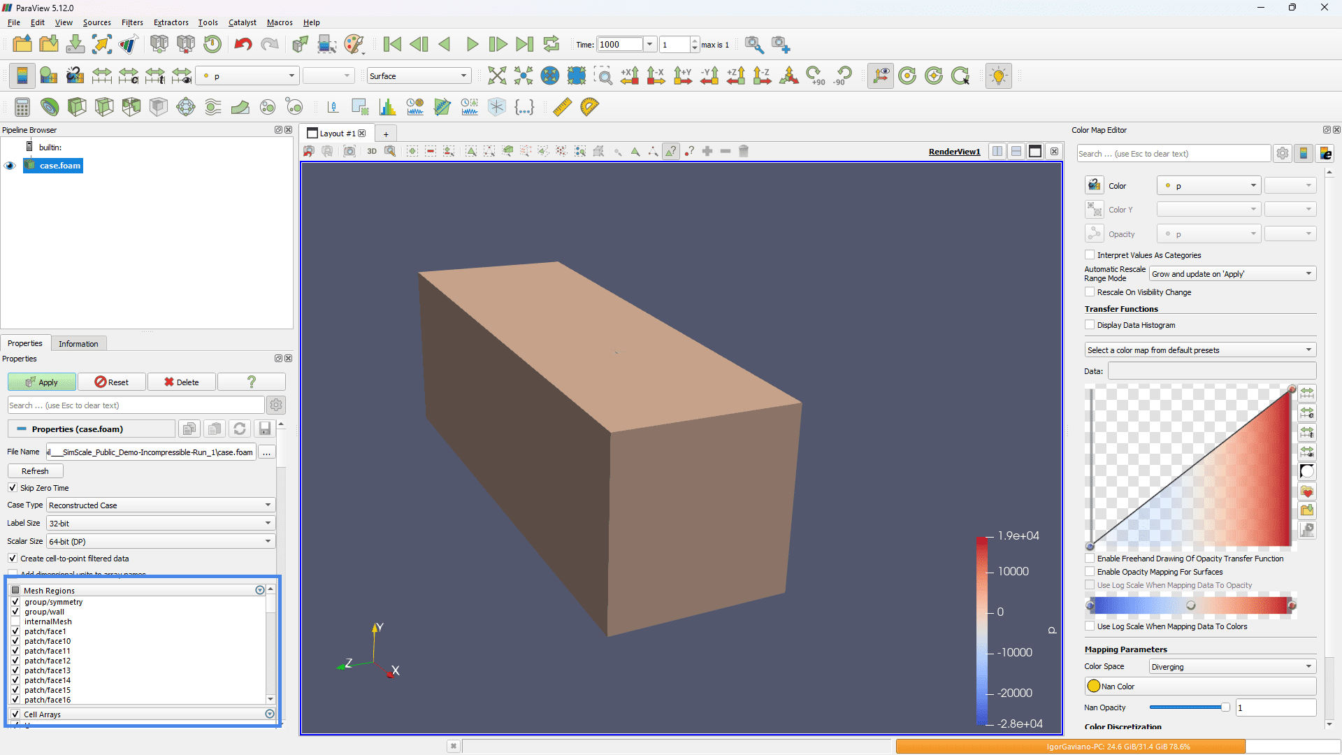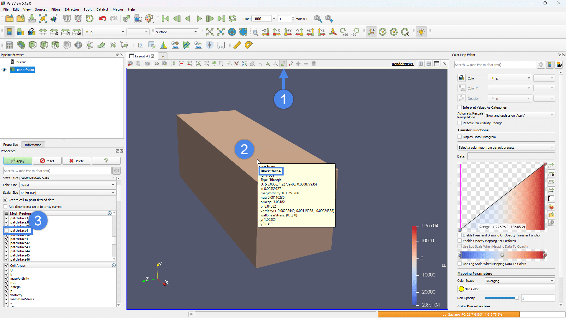 After the download is complete, open the case.foam file in ParaView and follow these steps: