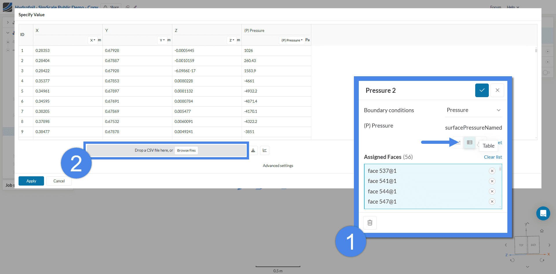 Select the Table icon and upload the .csv file exported from ParaView to map the pressure values accurately.
