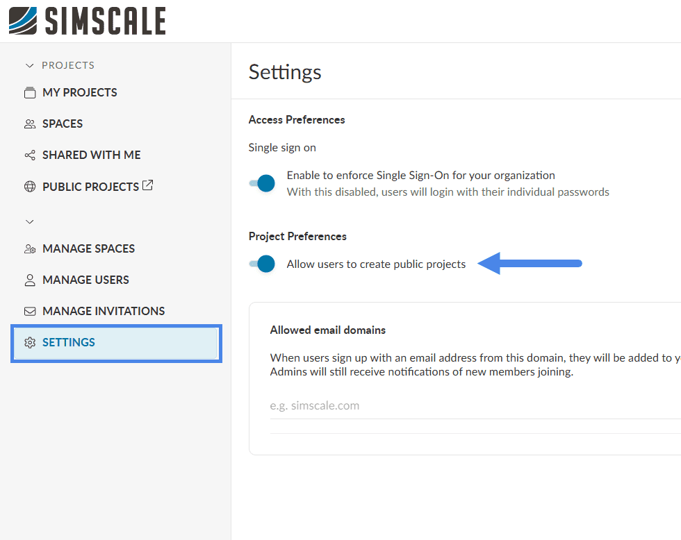 The admin needs to open the Dashboard and click on ‘Settings’ → Allow users to create public projects.
