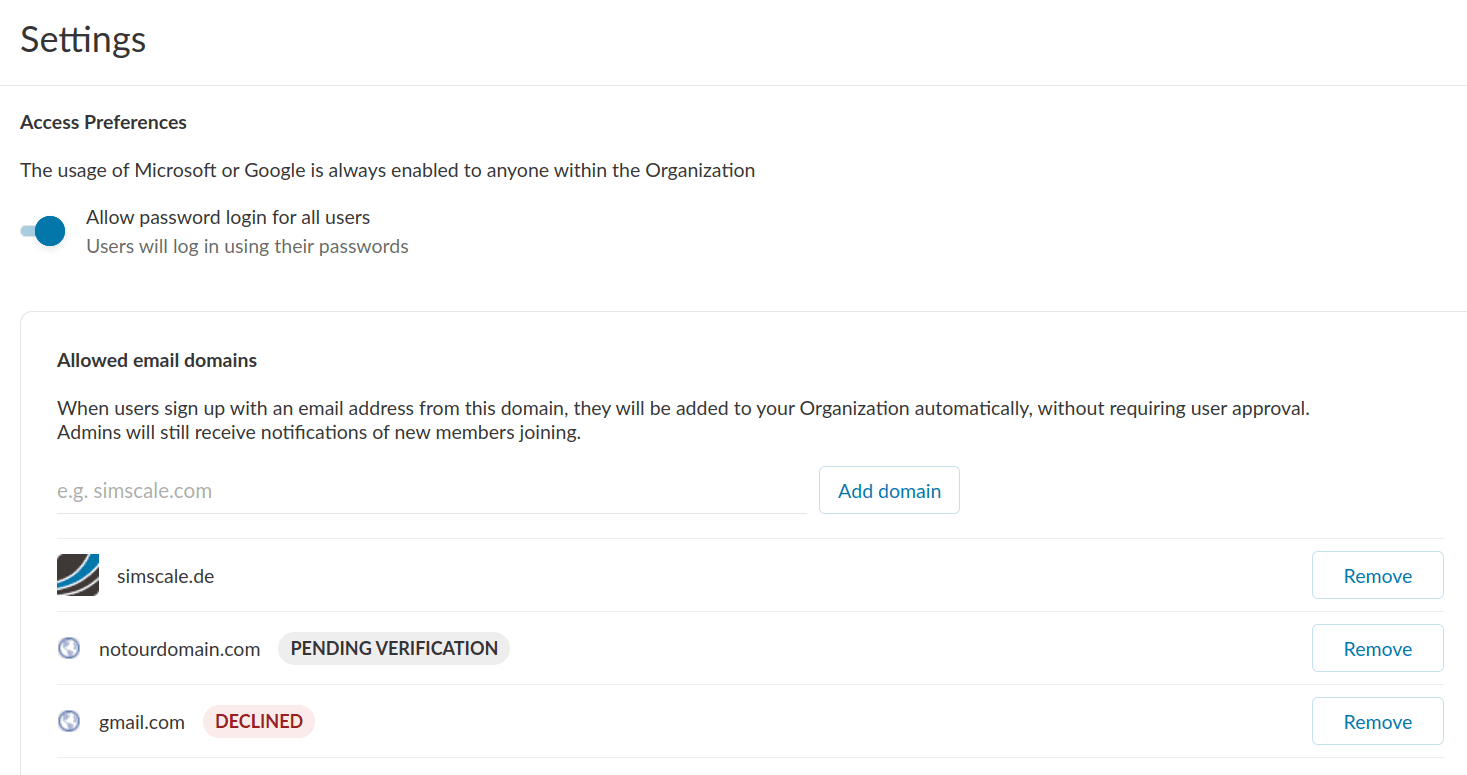 After adding a domain (such as companyname.com) and pressing the “Add domain” button, your Customer Success Manager in SimScale will receive a notification of a domain claim request. It will be manually reviewed and accepted or denied.